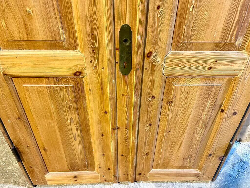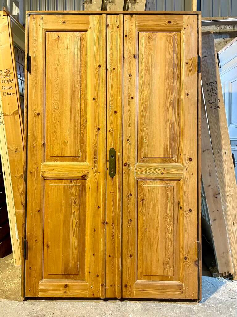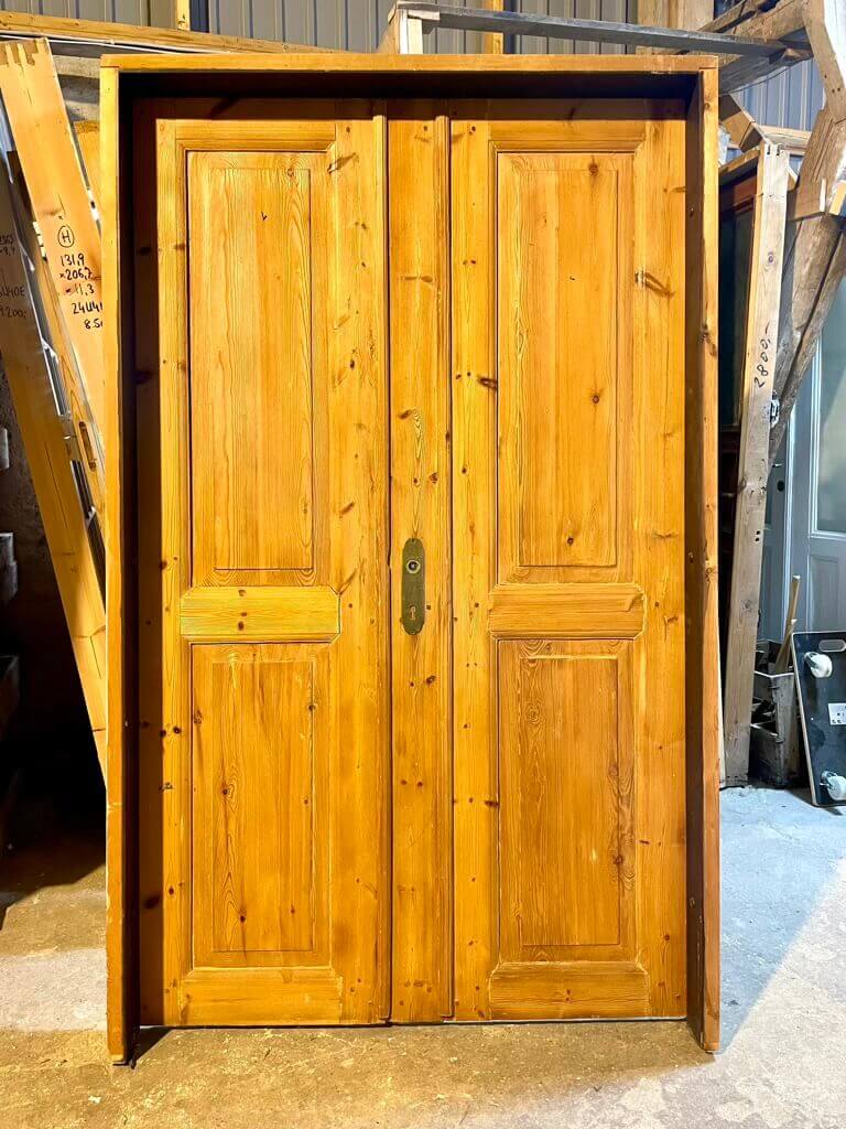 Klassisk, afsyret dobbeltdør med original karm (og uden bundstykke). Døren er uden greb, men med meget fine langskilte i messing samt fungerende låsekasse.
