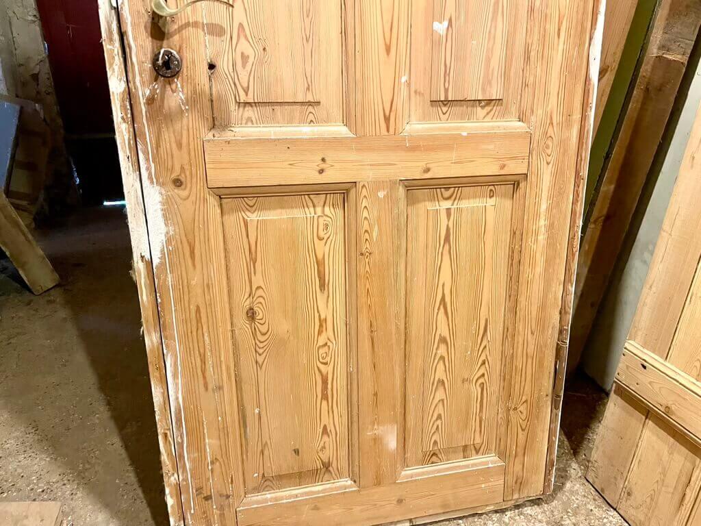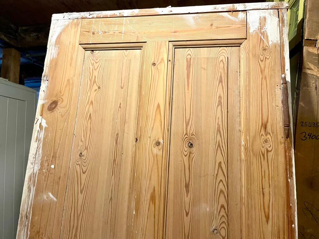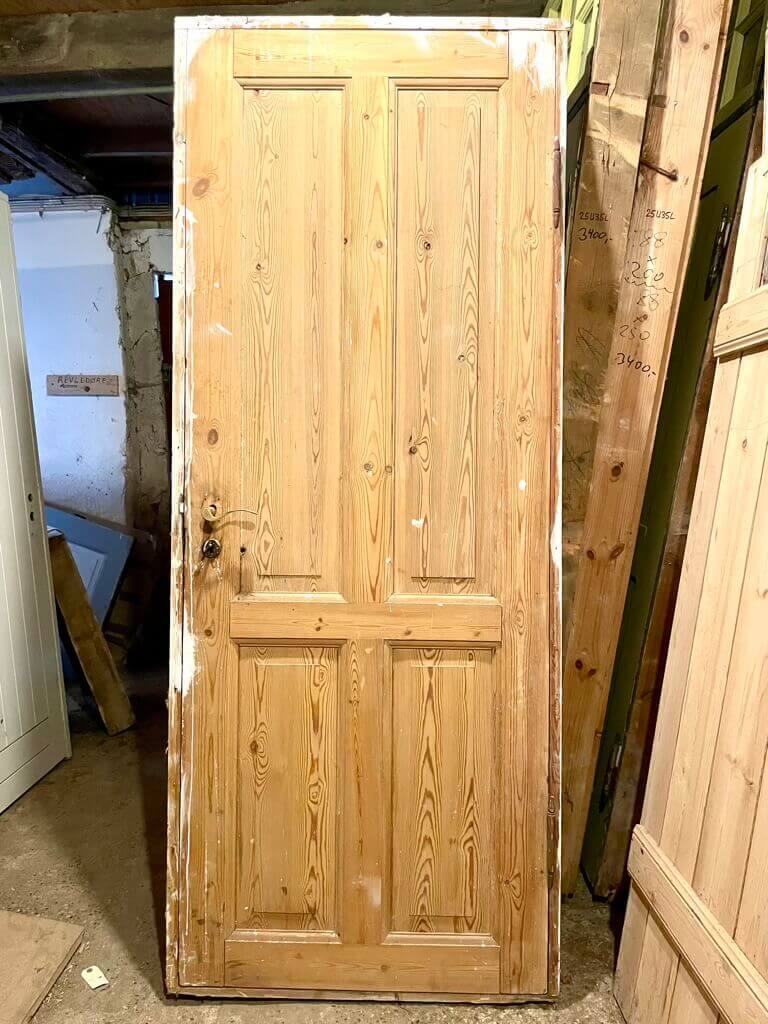 Klassisk og afsyret Dannebrogsdør med originale hamborghængsler og bundstykke. Fremstår med sundt træværk samt overfladisk snavs og almindelig slitage.