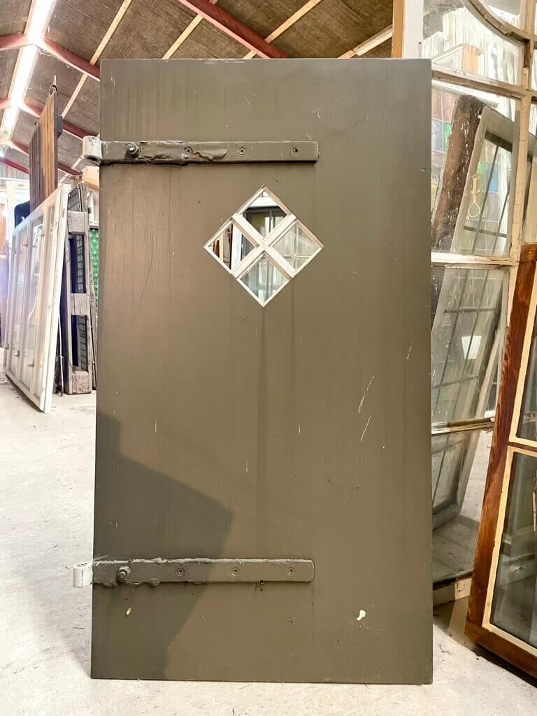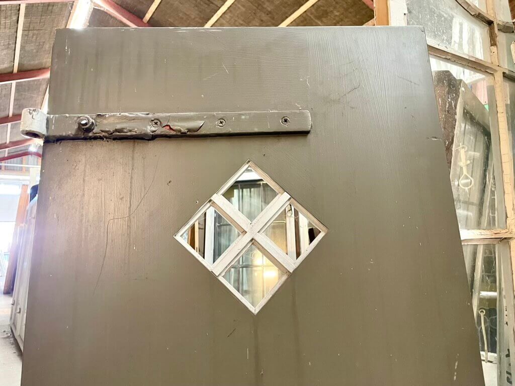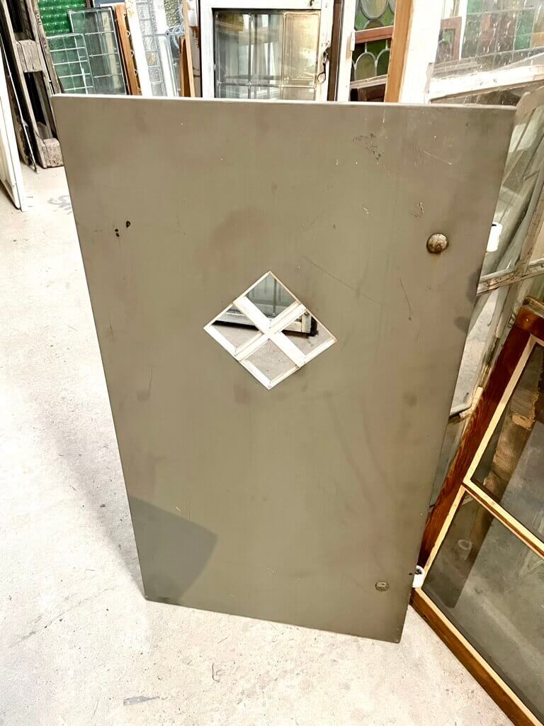 Unik, lille vinduesskodde med kvadratisk, småsprosset rude (uden glas). Med store, pæne hængsler (uden stabler). Fremstår pæn og velholdt.