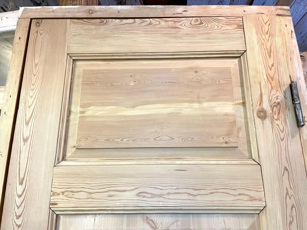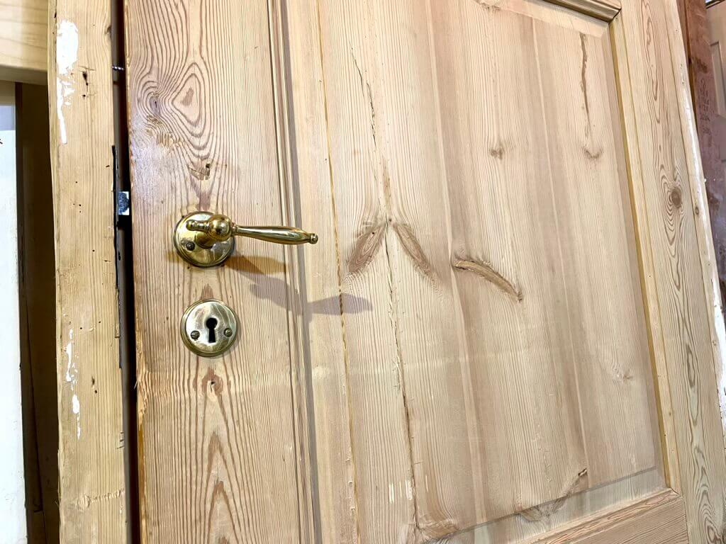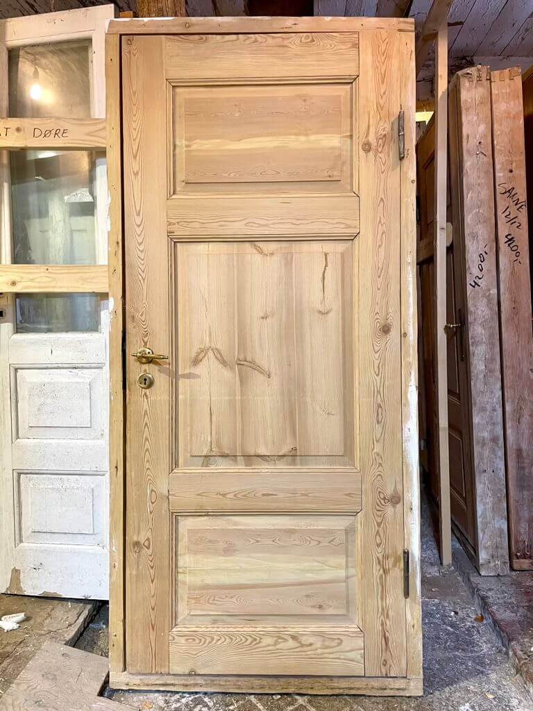 Smuk, original og afsyret fyldningsdør med tre felter og solid karm og bundstykke. Monteret med greb og nøgleskilte i messing.