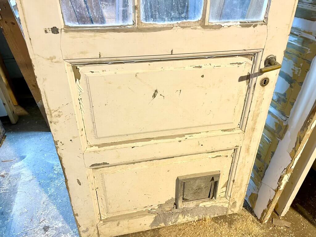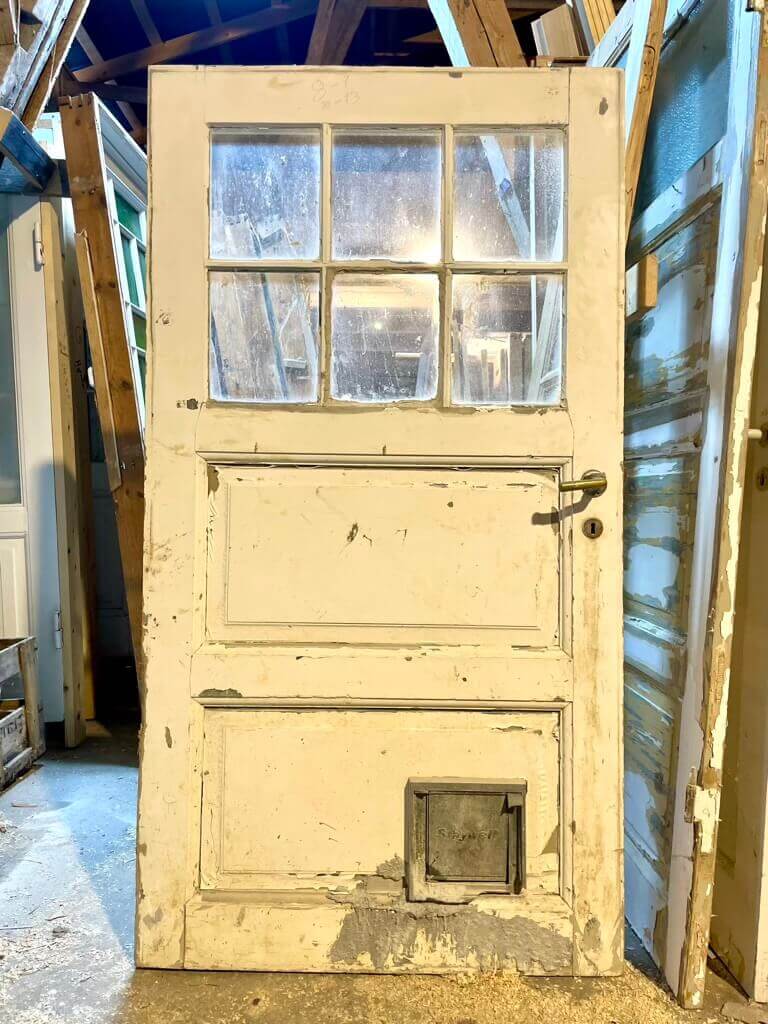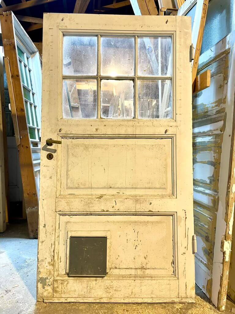 Original udvendig dør oprindeligt brugt som kælderddør - derfor den lave højde. Med pæne felter samt vinduesparti af seks kittede ruder.
