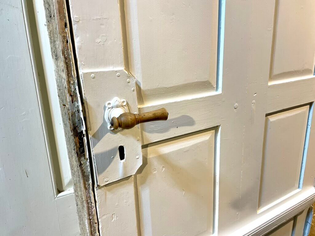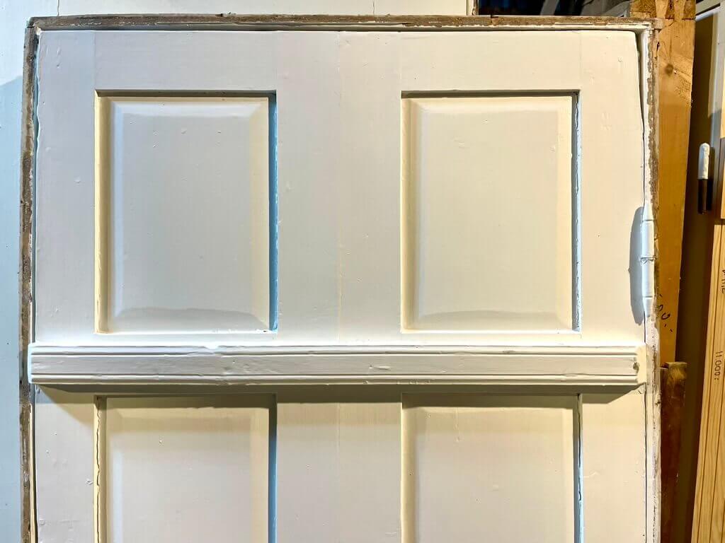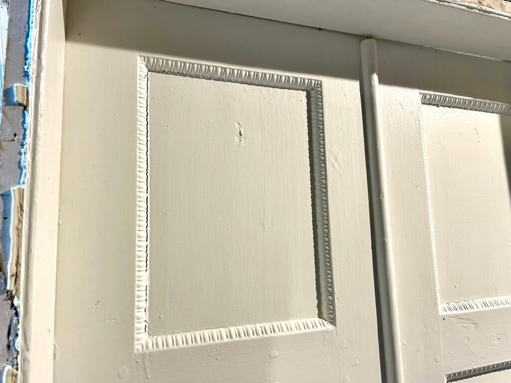 Bred og lav fyldningsdør. Oprindeligt sat sammen af to smallere låger og beklædt med lister på begge sider. Indersiden har meget smukke og unikke profiler i fyldningerne.