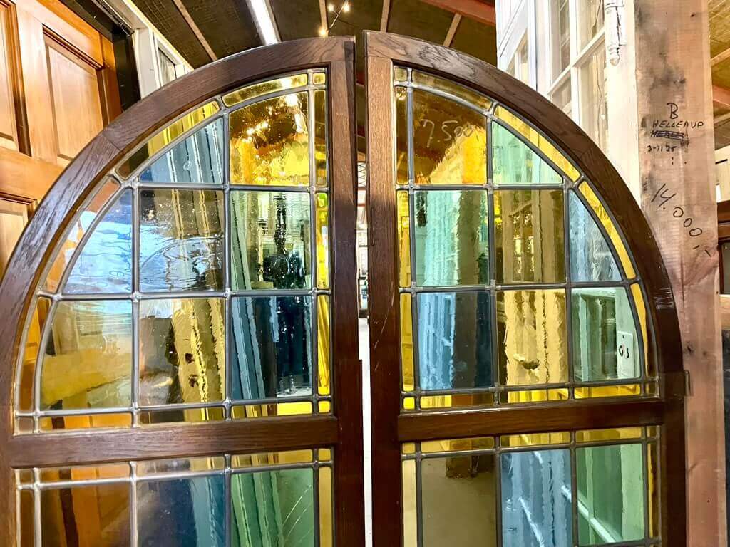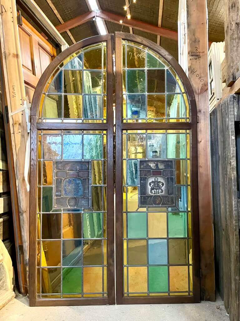 Yderst sjældent, dobbelt forsatsvindue (uden karm/ramme) med buet rope og blyindfattede glas i forskellige farver og former. Med blyindfattet motiv.