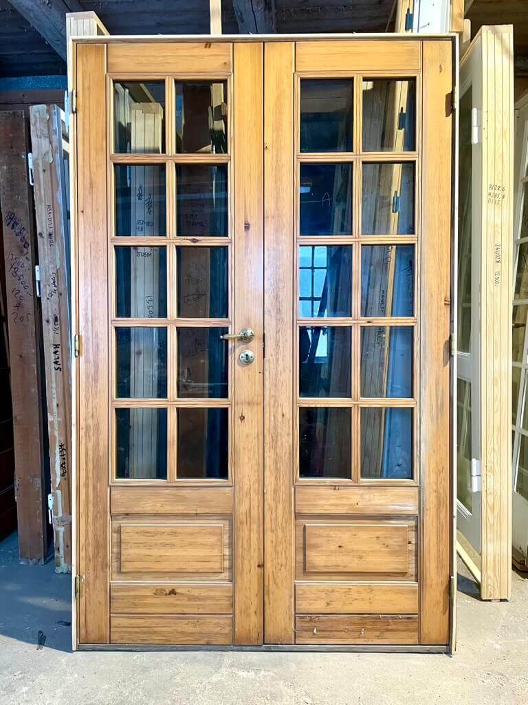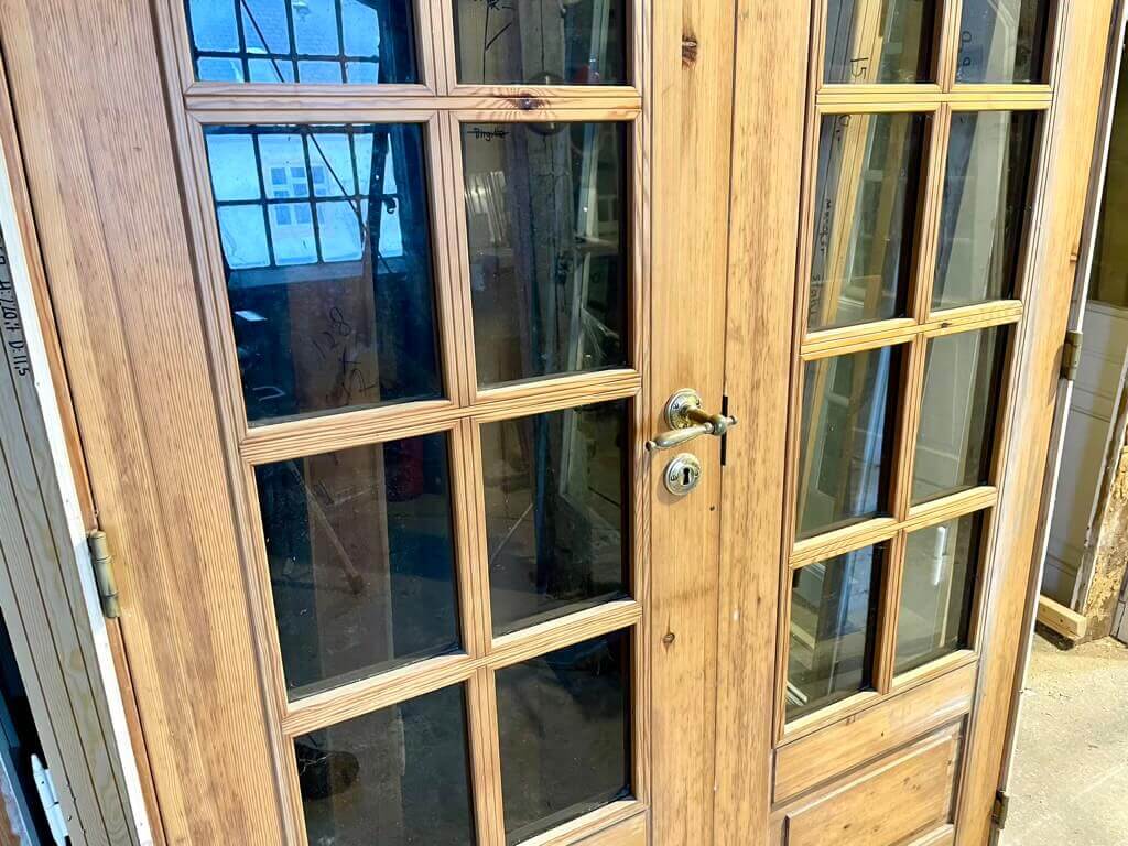 Pæn, dobbelt fransk dør med karm, bundstykke og snap-in hængsler. Monteret med greb og nøgleskilte i messing.
