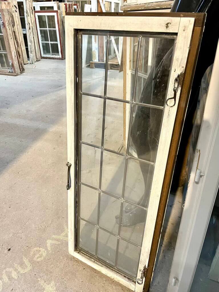 Løs vinduesramme (vindue uden karm) med én stor termorude, hvori der er indlagt blyindfattet parti med 15 små ruder.