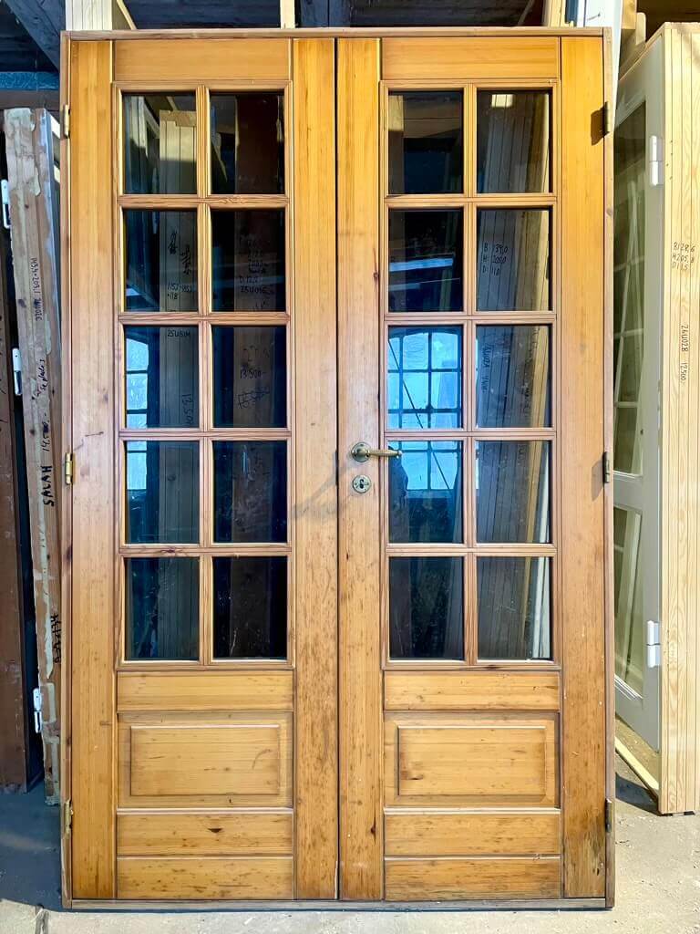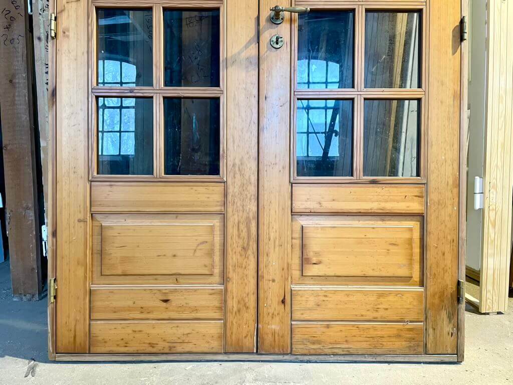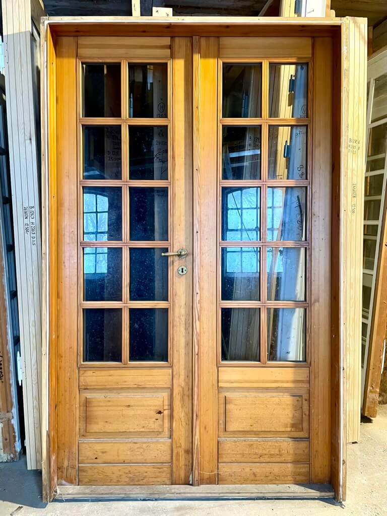 Fin, dobbelt glasdør med karm og bundstykke. Monteret med pæne greb og tilhørende nøgleskilte i messing.
