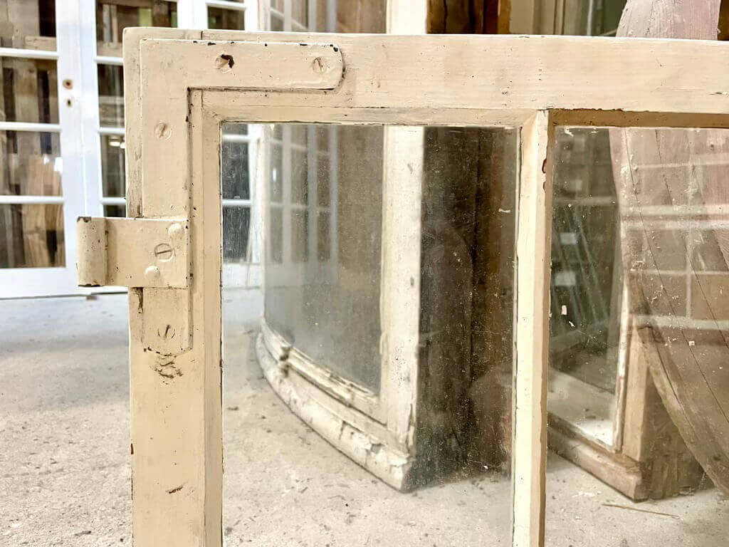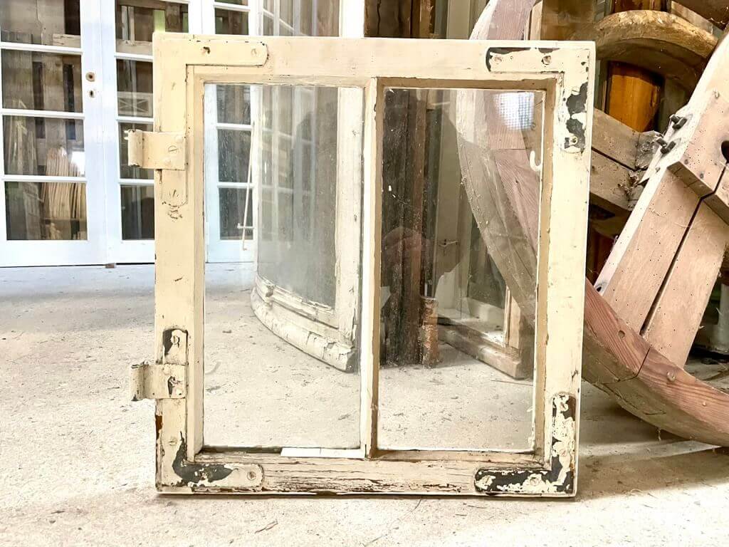 Fin, lille og original vinduesramme med to ruder og smal, lodret sprosse. Ruderne er kittet i. Sundt træværk samt stedvis afskallende maling samt kit med behov for små lapninger.