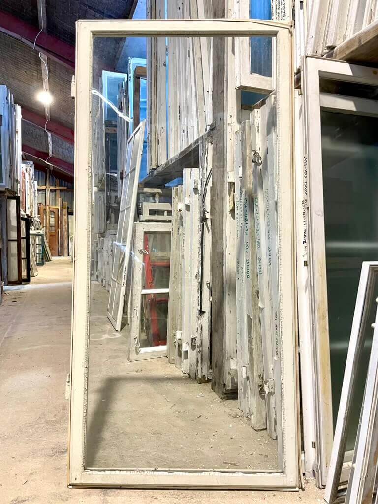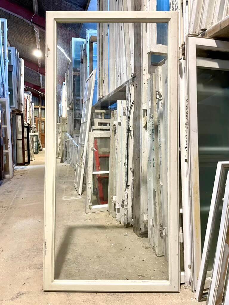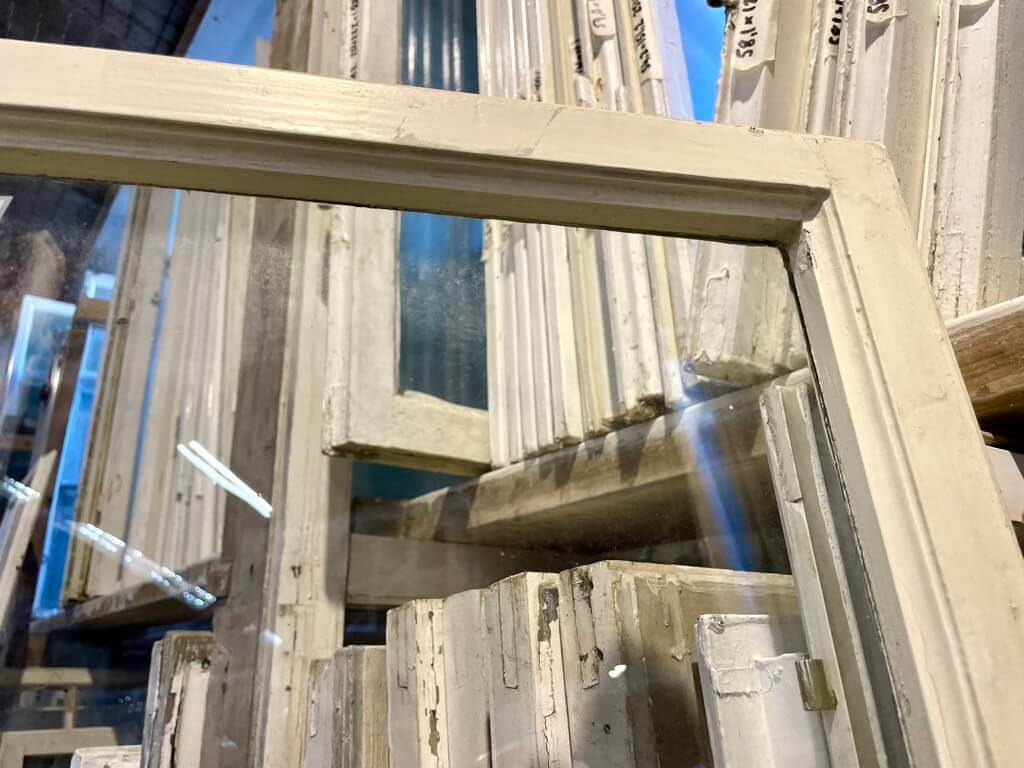 Klassisk forsatsramme med en uhørt stor rude i originalt, blæst glas. Lysmålet er på ca. 49,5 x 112,5 cm. Kan derfor være velegnet som "reserveglas", hvis du er så heldig at eje en ældre ejendom med originale vinduer. Ellers sundt træværk og kit, der blot skal pletrepareres.