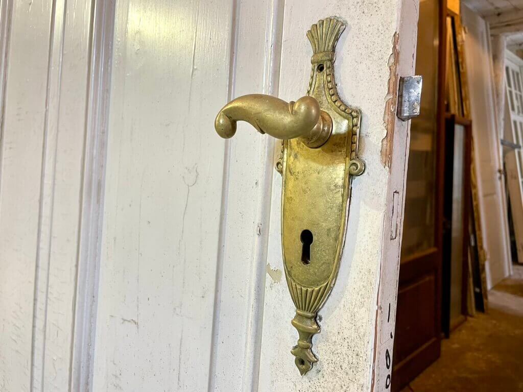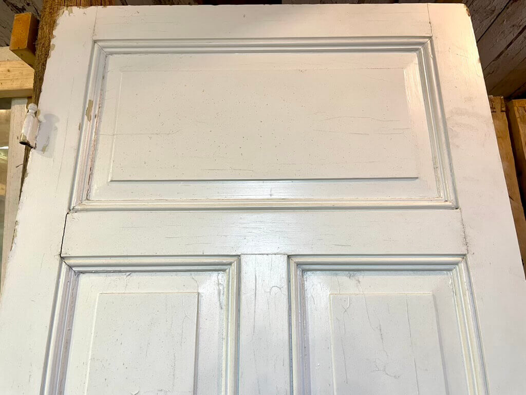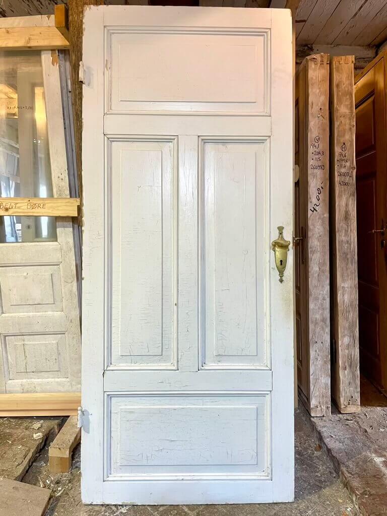 Klassisk fyldningsdør med fire felter og meget fine profiler. Monteret med smukke S-greb i messing samt langskilt på den ene side og rodet og nøgleskilt i messing på den anden. Fremstår med fint træværk, almindelige, overfladiske brugsspor samt afskallende maling. Oprindeligt venstrehængt. Uden karm.