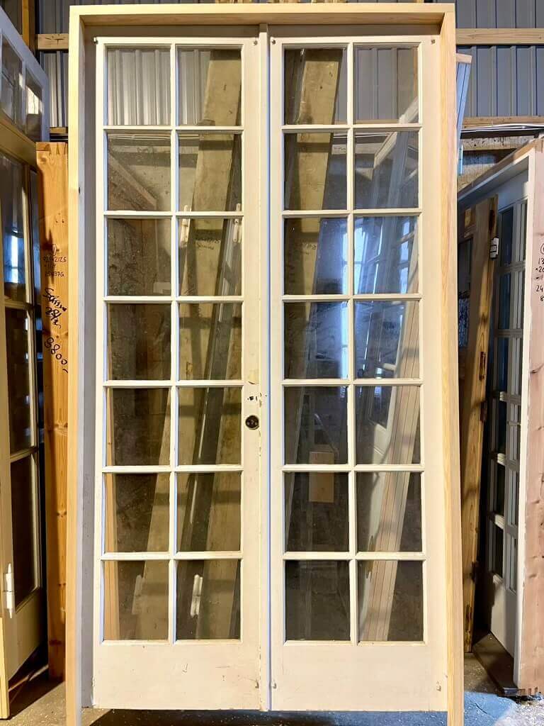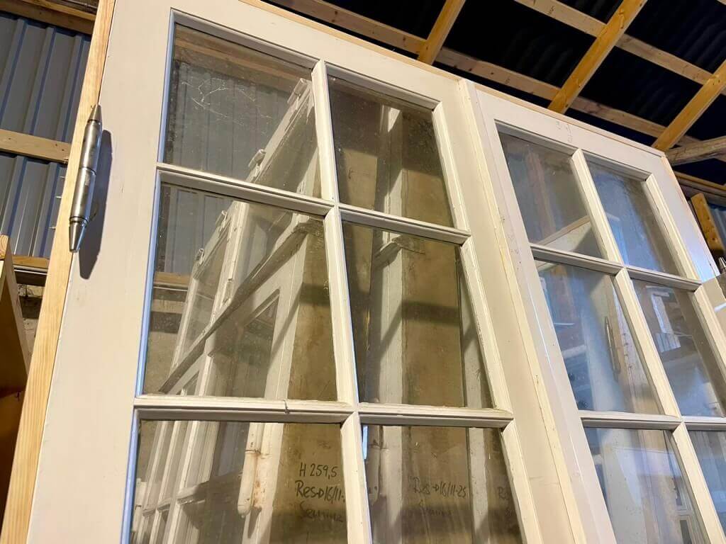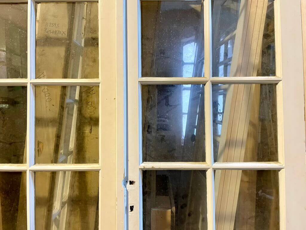 Klassisk og høj fransk dobbeltdør. Med 14 rudefelter i hvert dørblad. Fremstår med sundt træværk, overfladiske brugsspor og uden greb.
