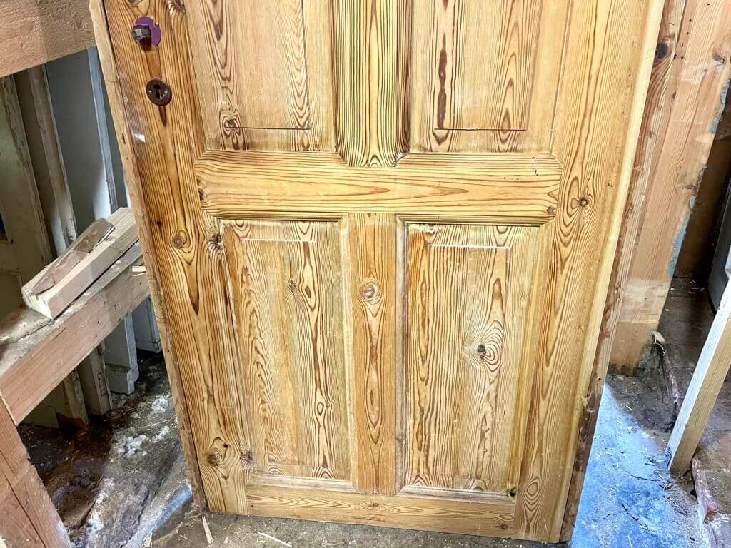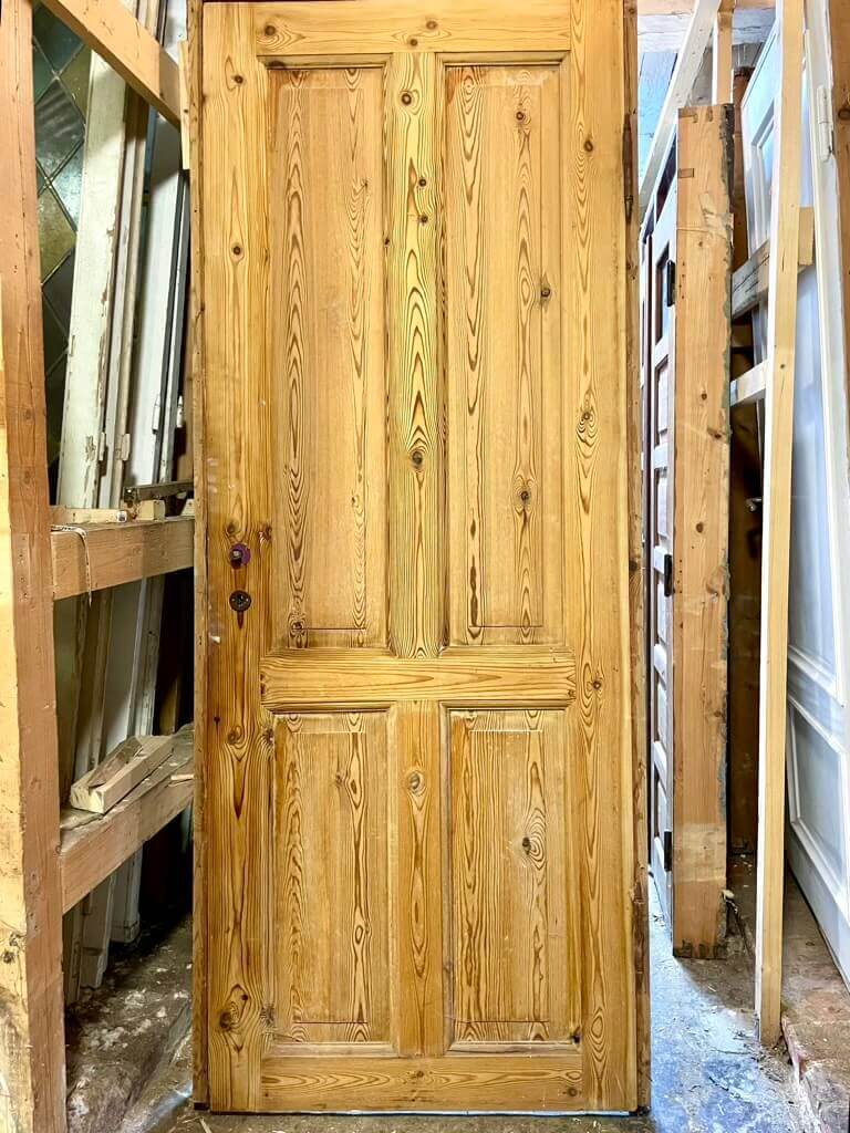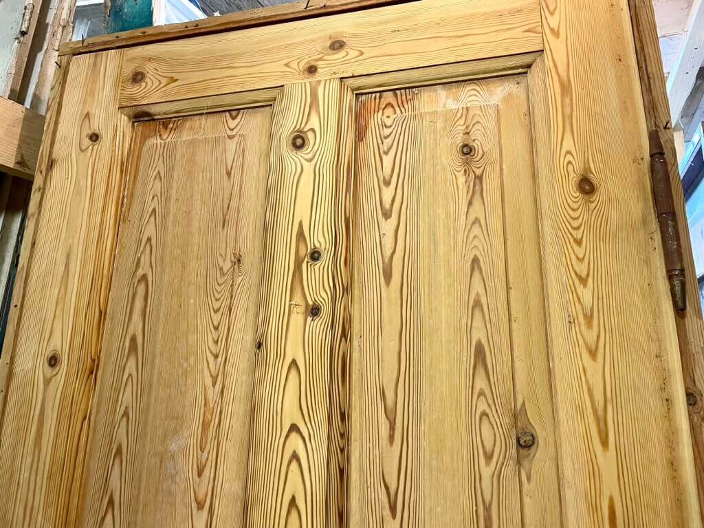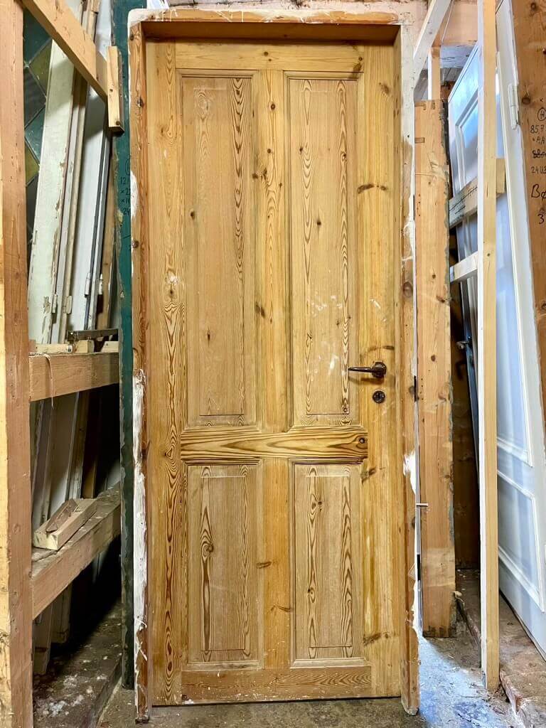 Fin, afsyret Dannebrogsdør med original karm og pæne hamborghængsler. Uden greb og uden bundstykke. Døren fremstår med intakt karm, bevarede samlinger i dørbladet og med almindelige brugsspor.
