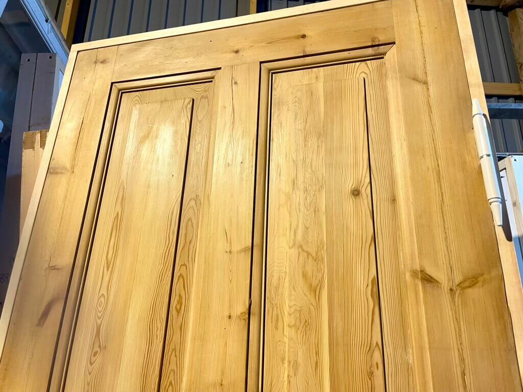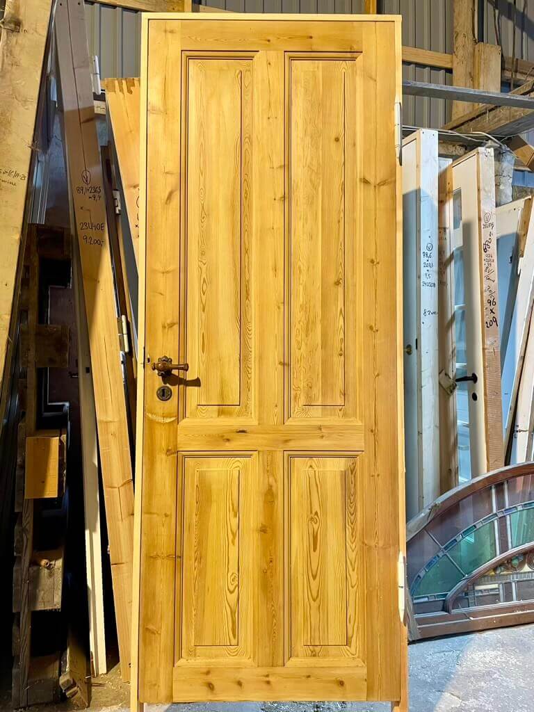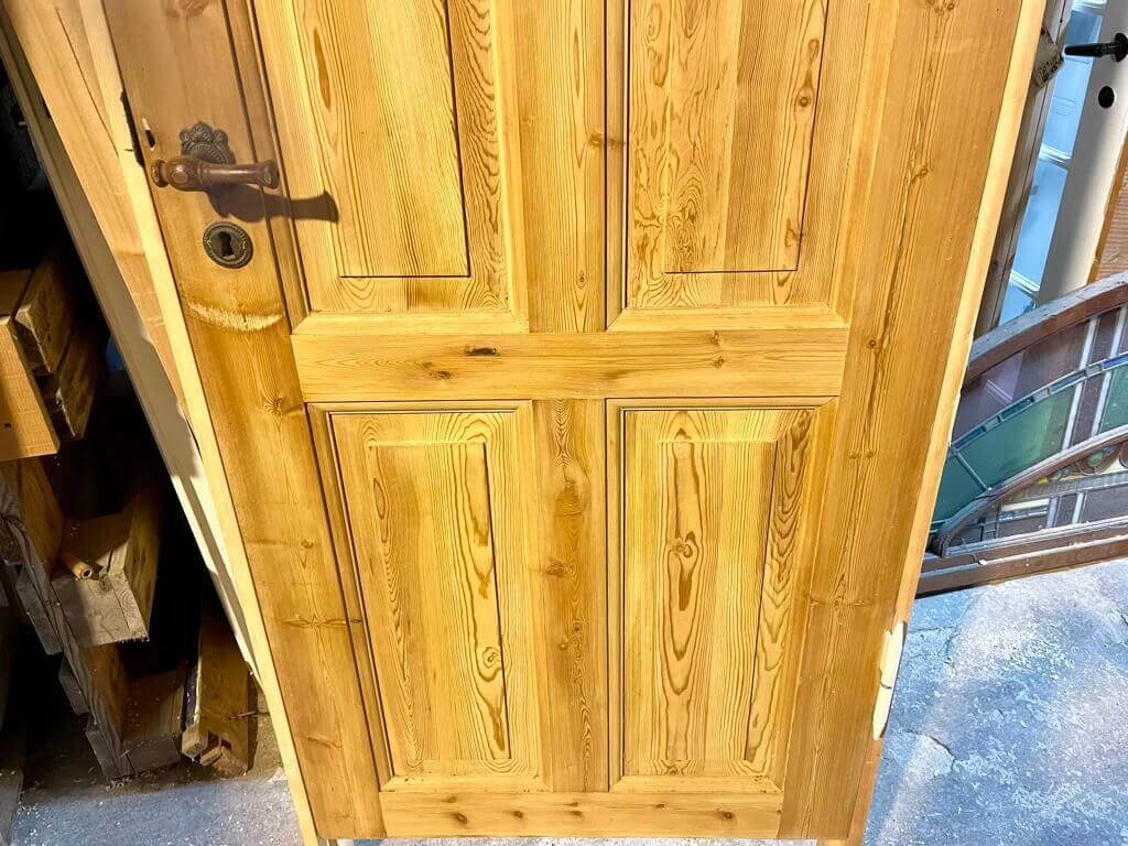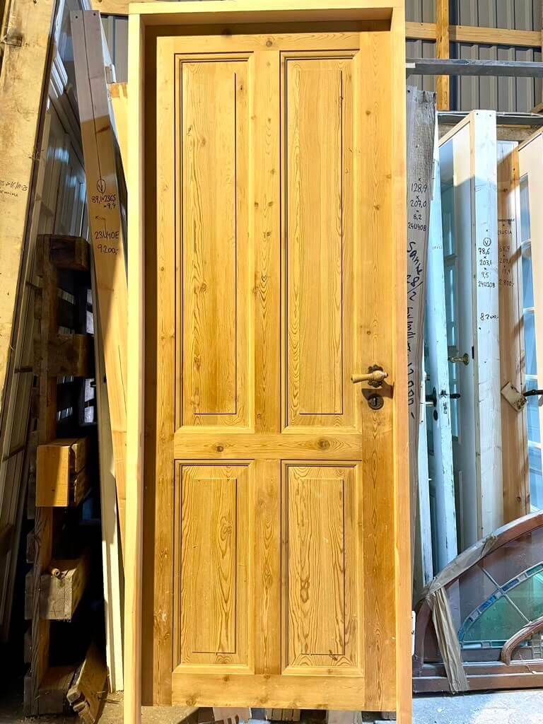 Smal Dannebrogsdør med komplet, ny karm af træ fra Københavns Listefabrik. Med nye hamborghængsler. Dørbladet er smukt afsyret og står med fine Københavnergreb med tilhørende nøgleskilte.