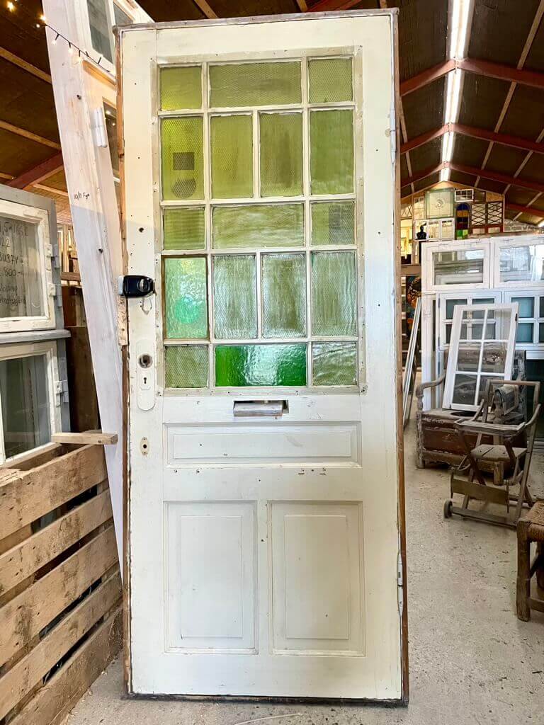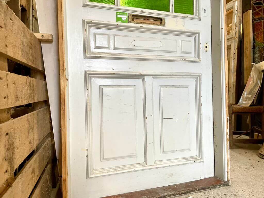 Klassisk, højrehængt opgangsdør fra 1905. Med original karm, bundstykke og hamborghængsler.