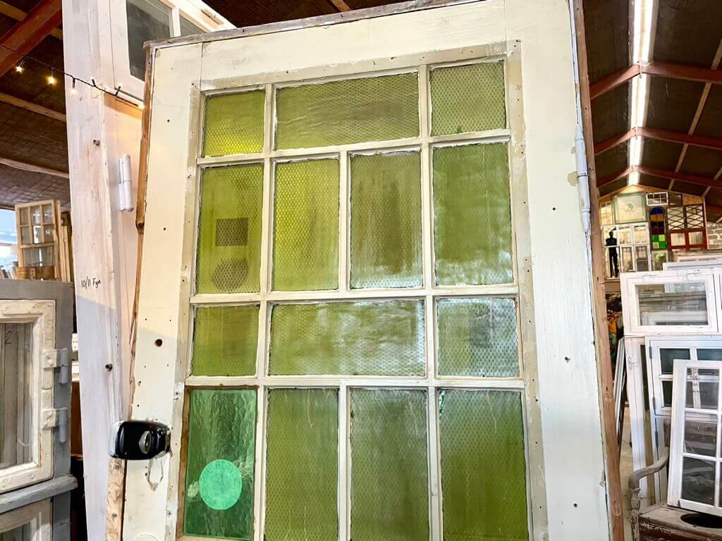 Ruderne er kittet i og er af grønt råglas. Pt. beklædt med folie.