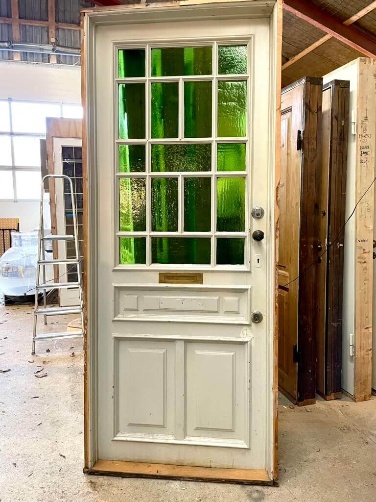 Fremstår med sundt træværk, smukke, grønne ruder i råglas og meget fine, detaljerige fyldninger.