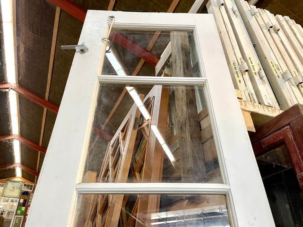 Højt og smalt vindue uden karm. Oprindeligt terrassedør og er derfor hængslet. Men al beslåning kan fjernes for at have et højt vindue med panel/fyldning nederst.