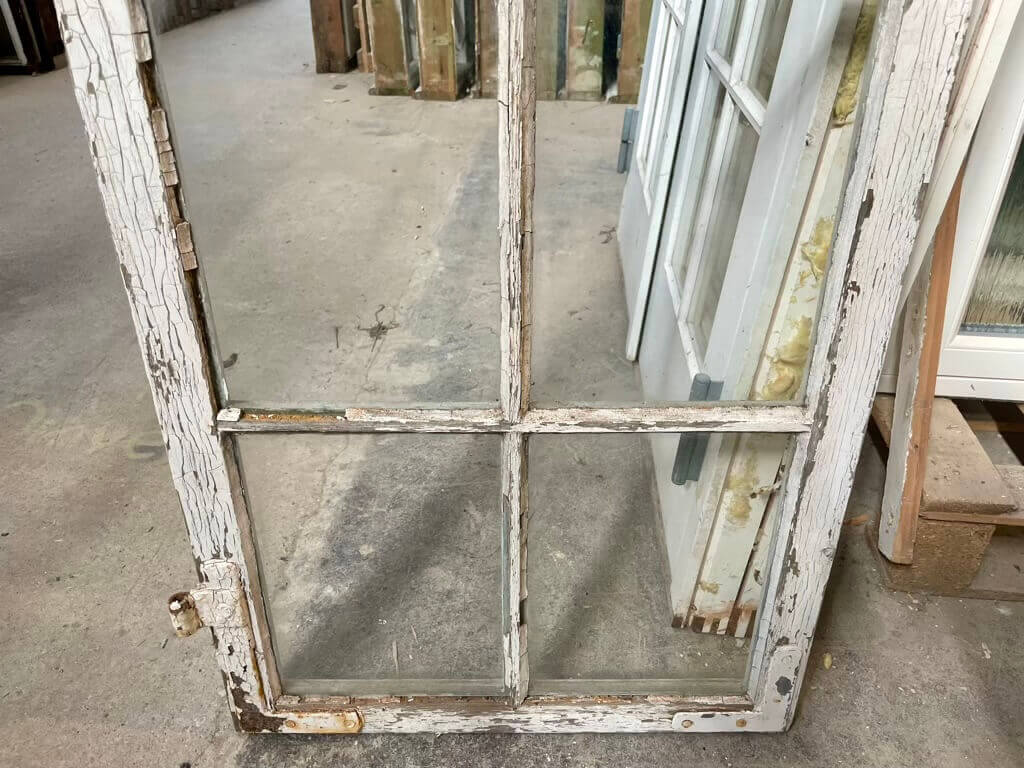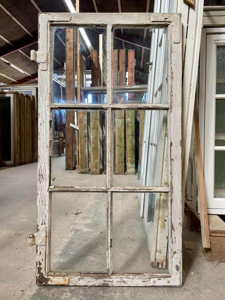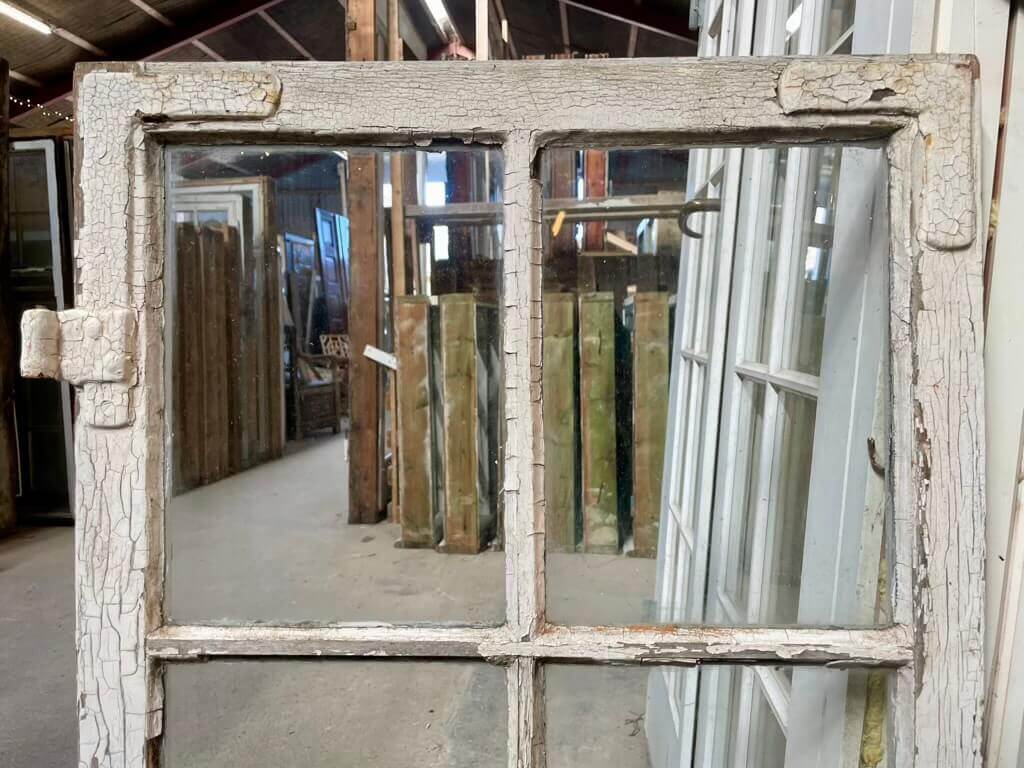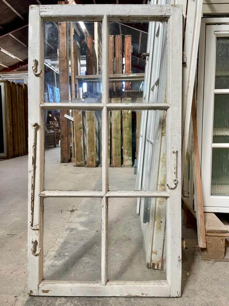 Fin, original 6-ruders vinduesramme i kernetræ. Med smalle sprosser og kittede ruder. Fremstår med sundt træværk samt behov for overfladisk istandsættelse (maling, kit og hæftning af hjørnebånd). Oprindeligt flere på lager; ét styk med tre manglende ruder sælges til lavere pris.