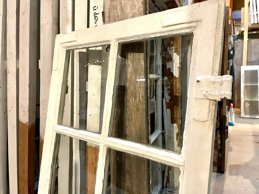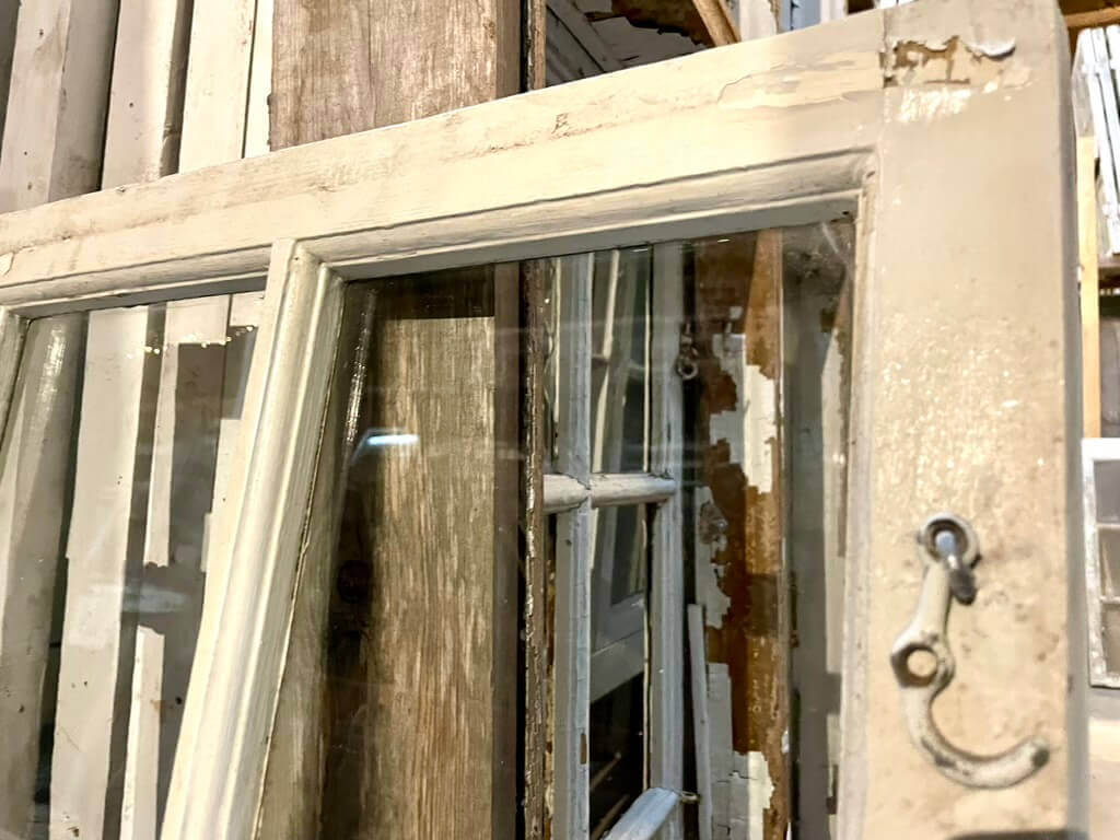 Klassisk, original 6-ruders vinduesramme med smalle sprosser og kittede ruder. De fleste ruder i gammelt, trukket glas. Fremstår med sundt træværk samt stedvis løs/afskallende maling og kit. Enkelte i partiet med en gået rude; sælges til 500 kr.