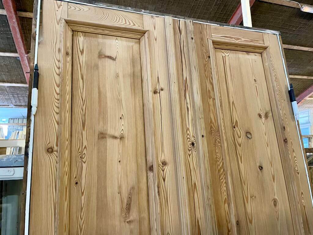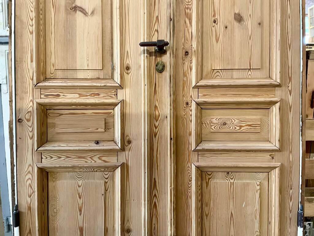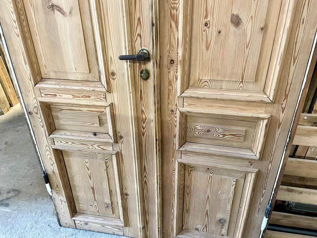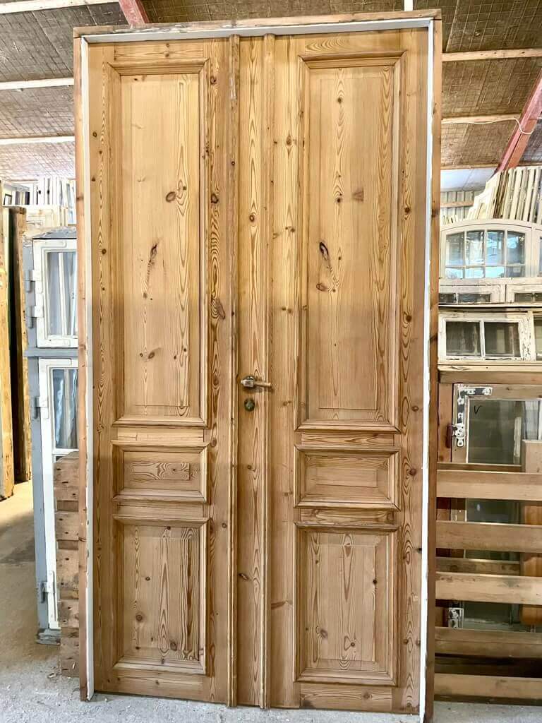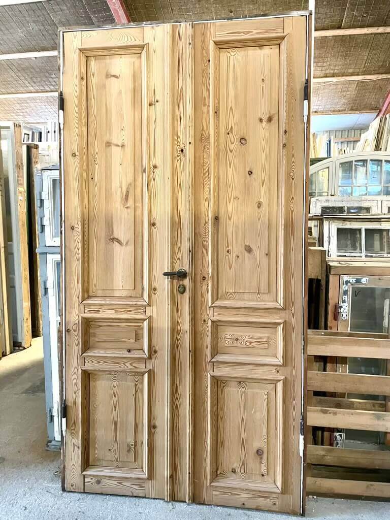 Klassisk, afsyret fløjdør fra herskabslejlighed på Frederiksberg opført i 1891. Med pæne hamborghængsler og original karm. Pæne fyldninger med fine detaljer.