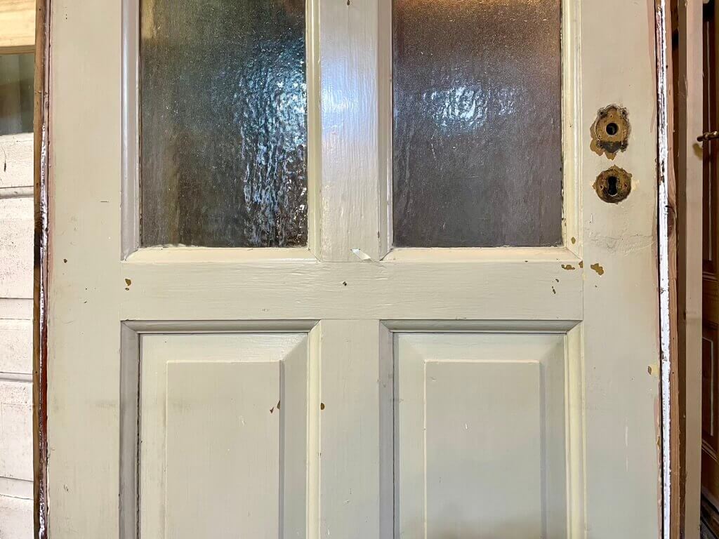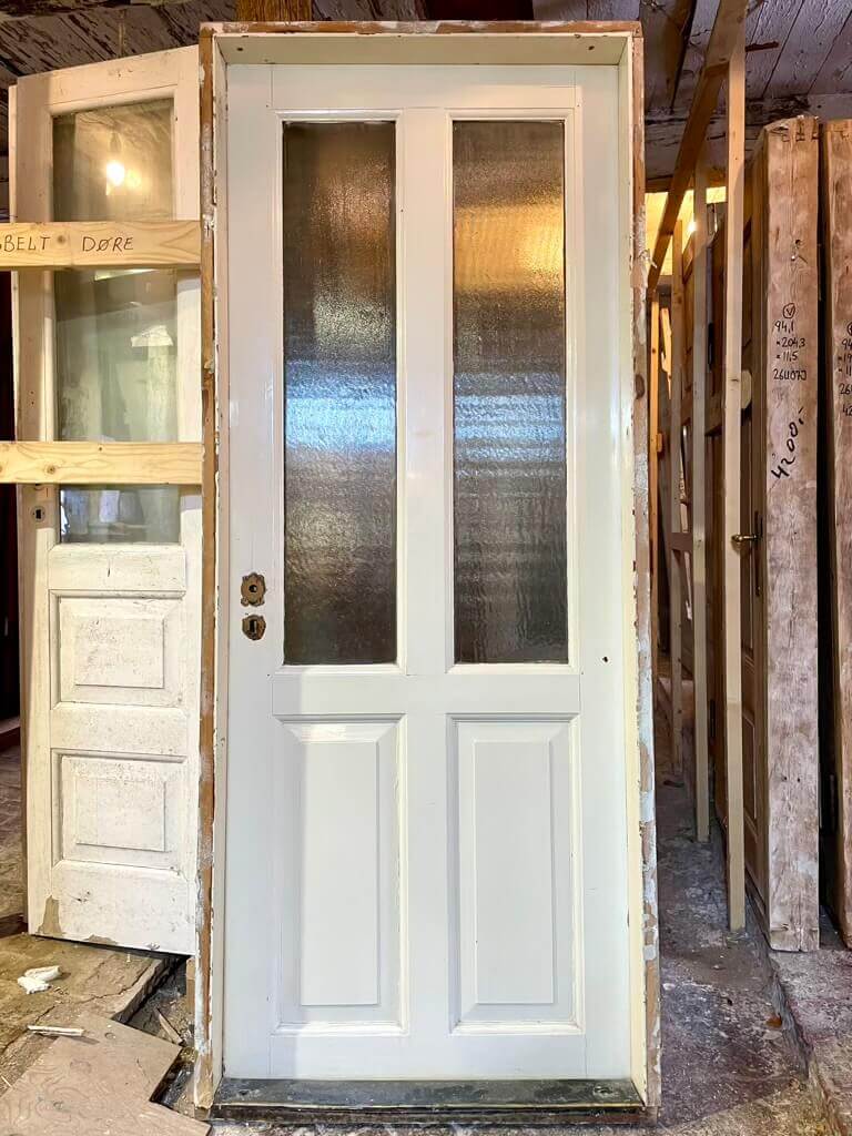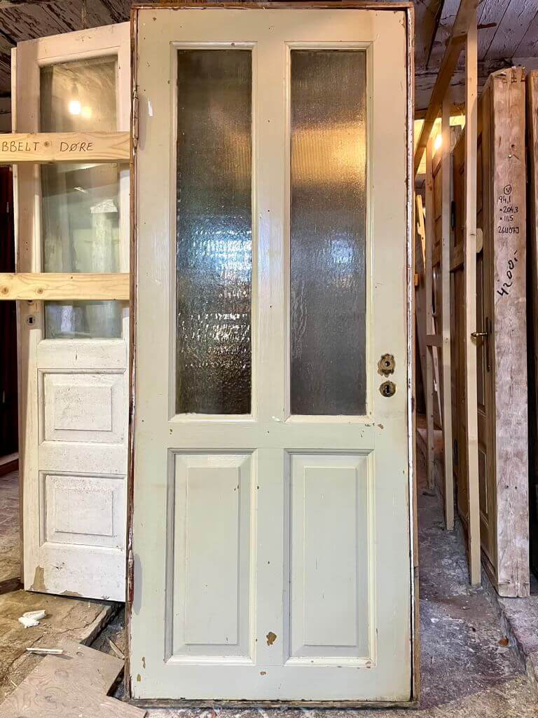 Klassisk Dannebrogsdør med de to øverste felter i matteret råglas. Derudover originale hamborghængsler, karm og bundstykke. Uden greb.