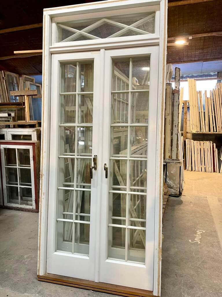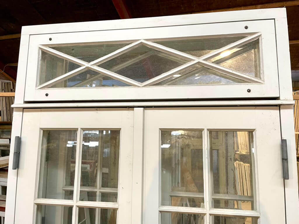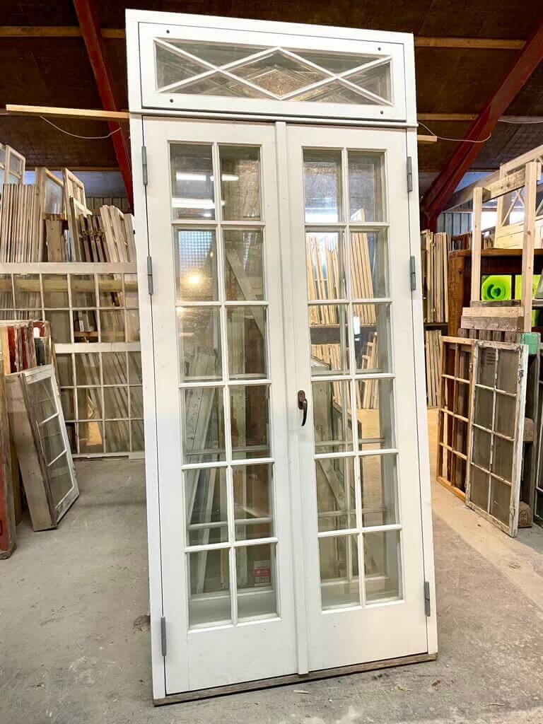 Smuk, dobbelt terrassedør med koblede rammer samt smukt overstykke med harlekinsprosser. Franske døre udvendigt med småsprossede, kittede ruder. Med karm og bundstykke i hårdt træ.