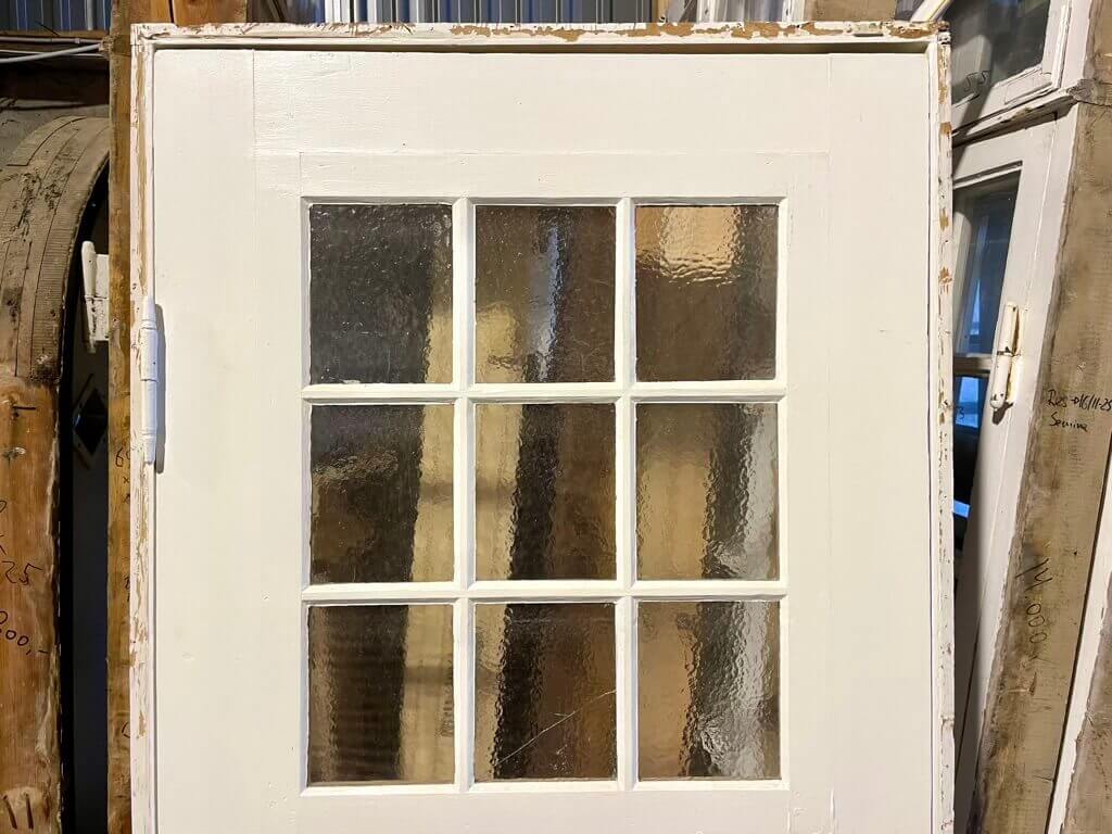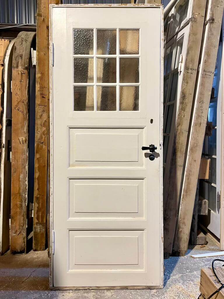 Fin og klassisk fyldningsdør med felter med pæne profiler samt 9-ruders, småsprosset vinduesparti med kittede ruder.