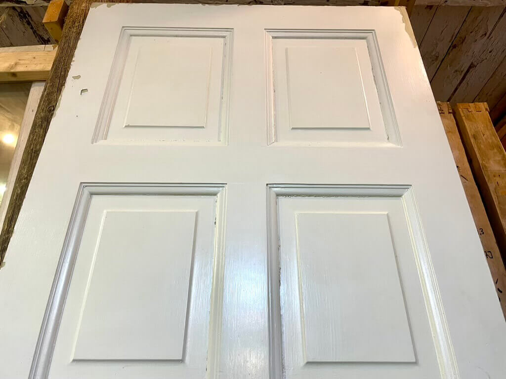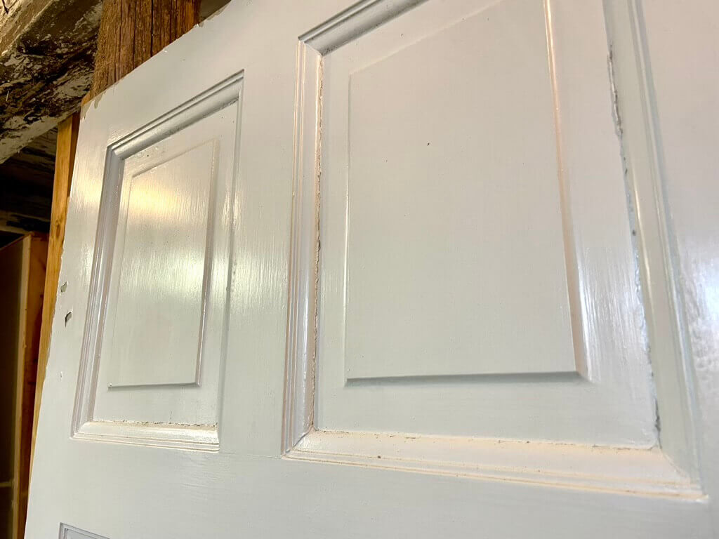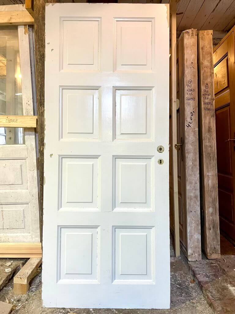 Smuk, klassisk fyldningsdør i Empire-stil med hele otte felter med fine profiler. Fremstår med sundt træværk samt overfladiske brugsspor og let afskallende maling.