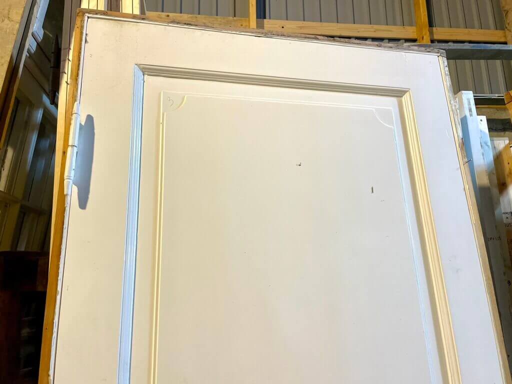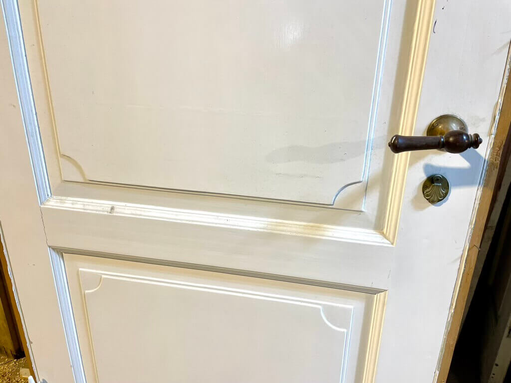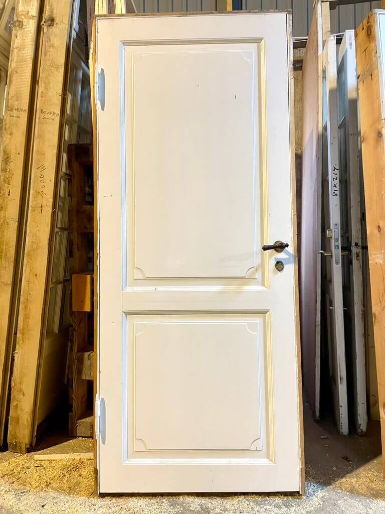 Klassisk fyldningsdør med sjældent fine fyldninger, profiler og udskæringer. Monteret med smukt Københavner-greb i træ på trompethalse i messing - med tilhørende nøgleskilte.