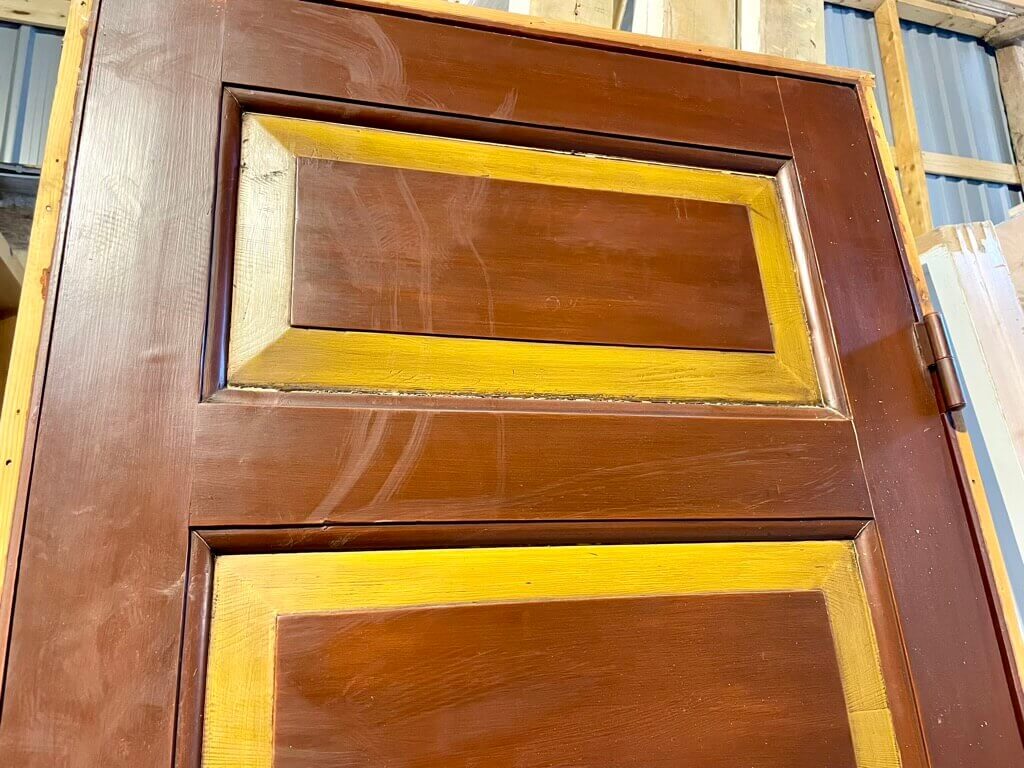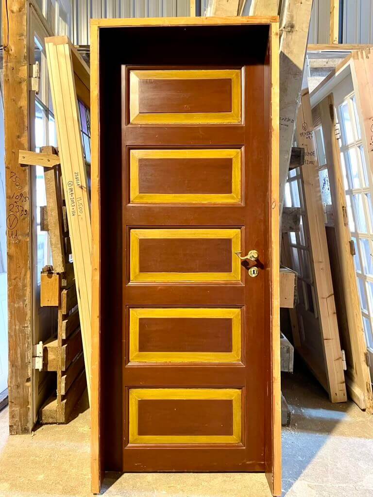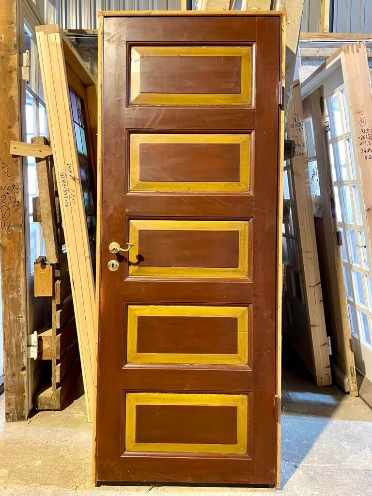 Klassisk fyldningsdør med fem felter, original karm og mørke farver. Fremstår med sundt træværk og almindelige brugsspor. Monteret med smukke messinggreb.