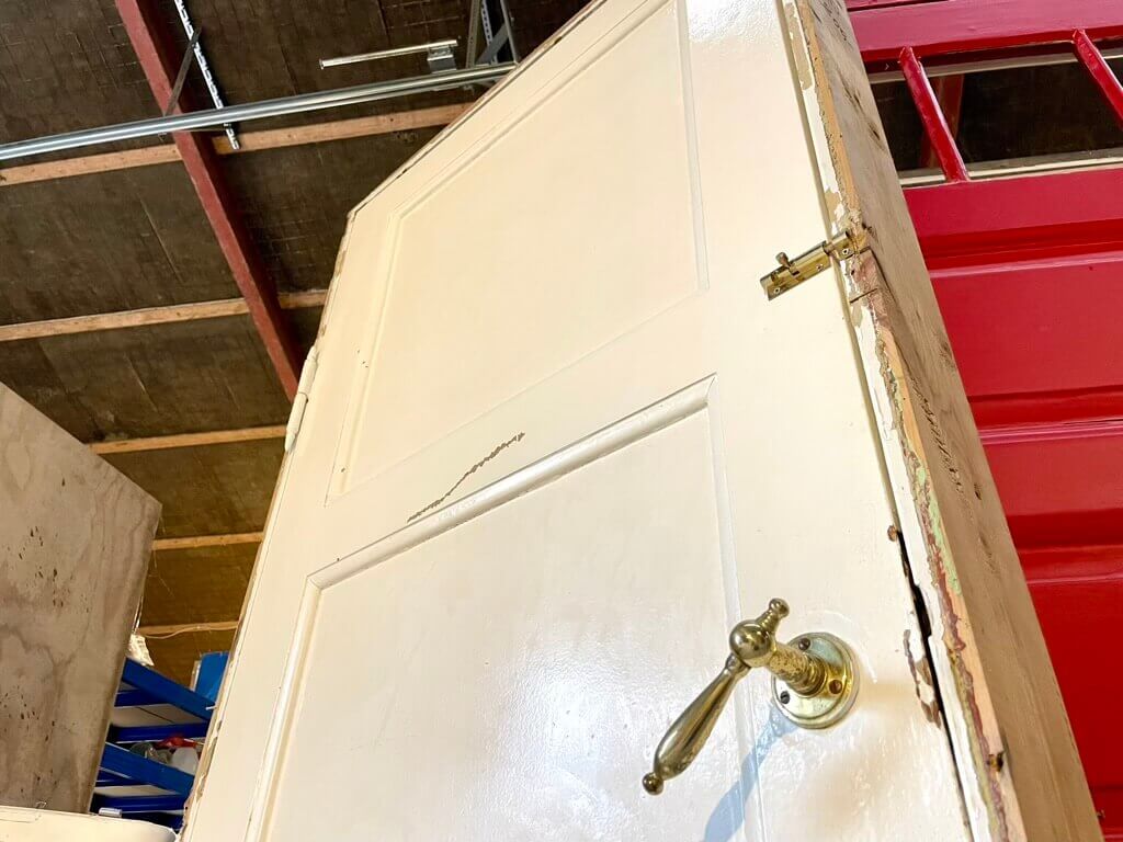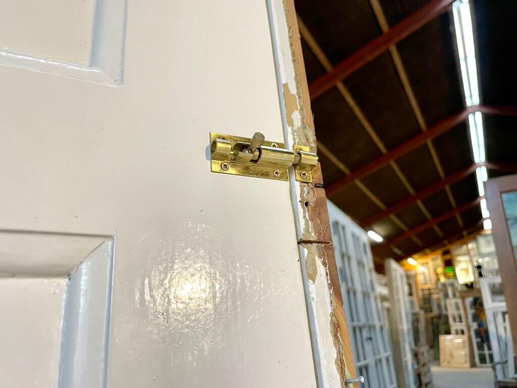 Klassisk fyldningsdør i sjældent lavt mål. Monteret med messinggreb og messinglås. Med original karm - oprindeligt med bundstykke, men pt uden. Kan genetableres eller anvend uden. Fremstår med sundt træværk og almindelige brugsspor - ridse i malingen på den ene side.