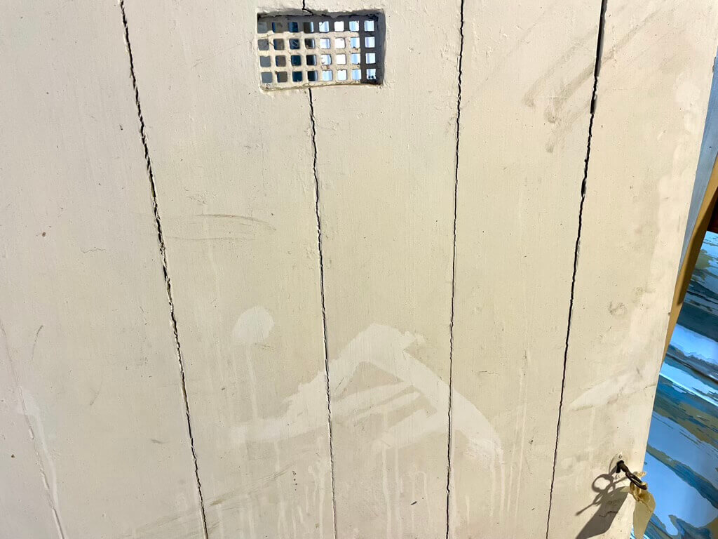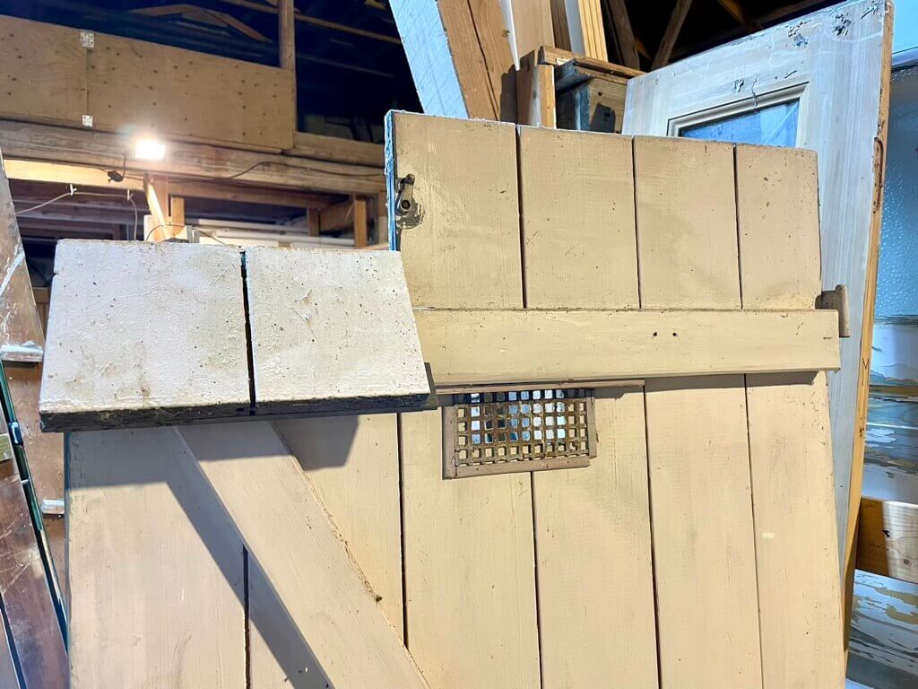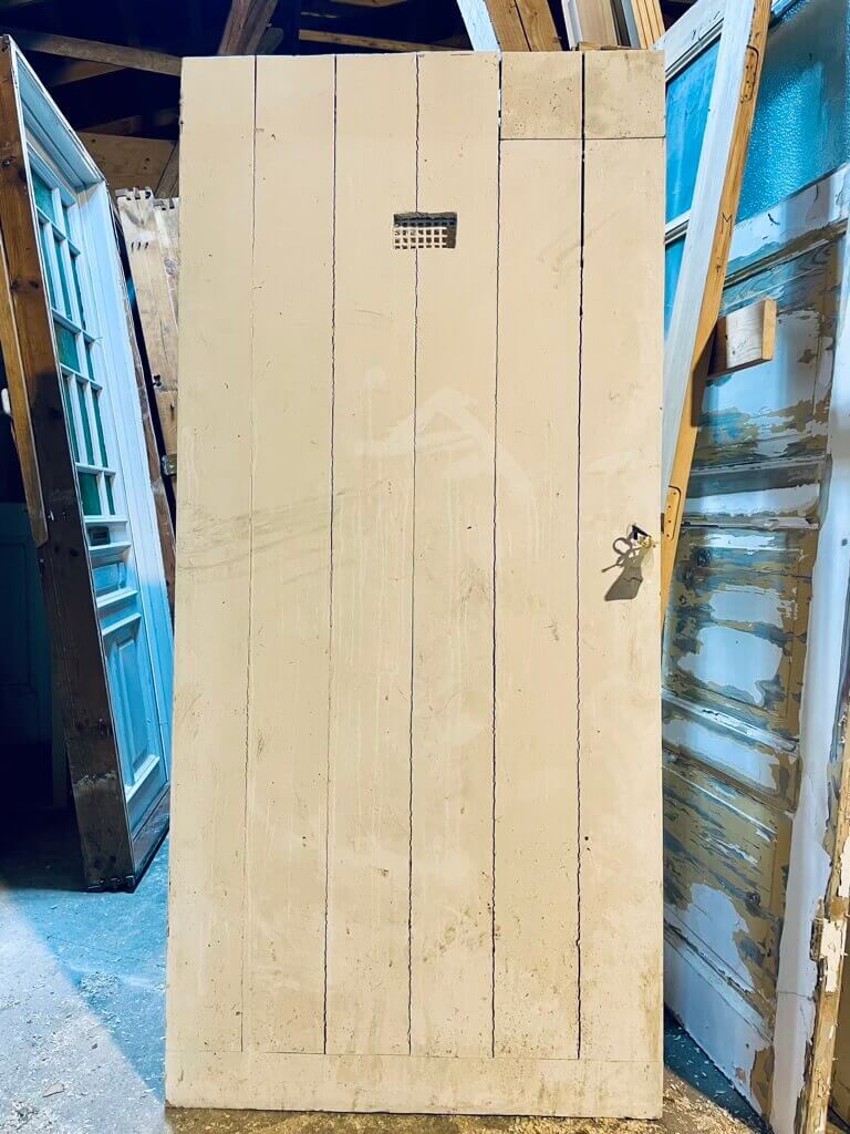 Klassisk revledør med kighuls-rist og hængsler lem øverst. Inkl. original nøgle.