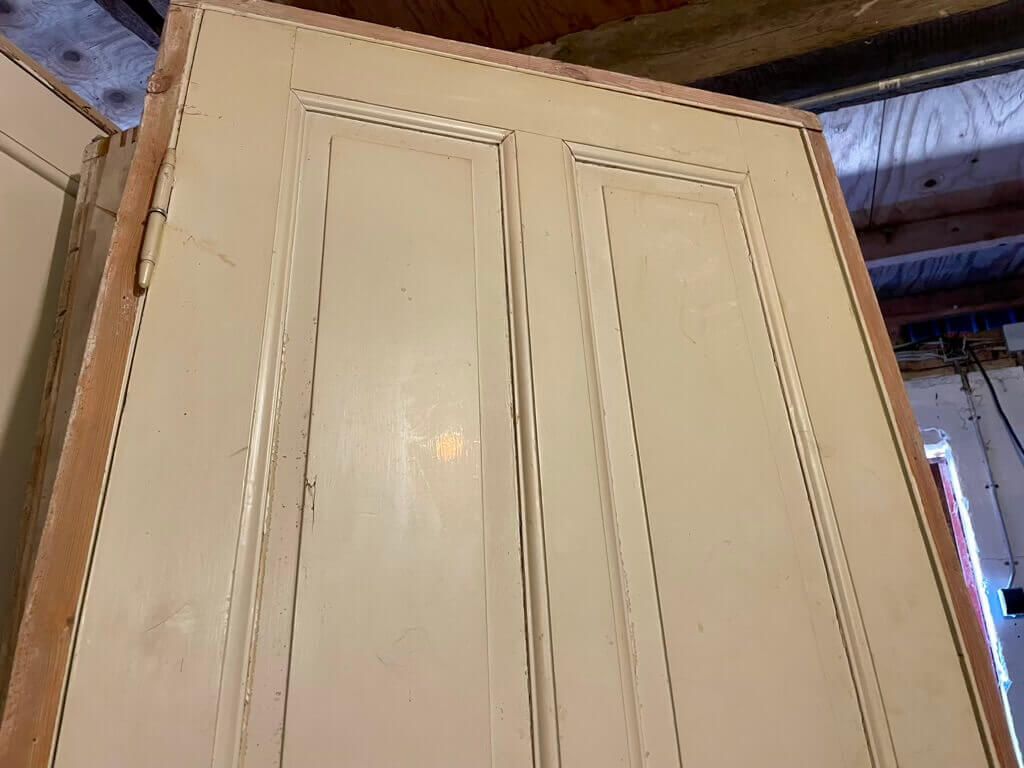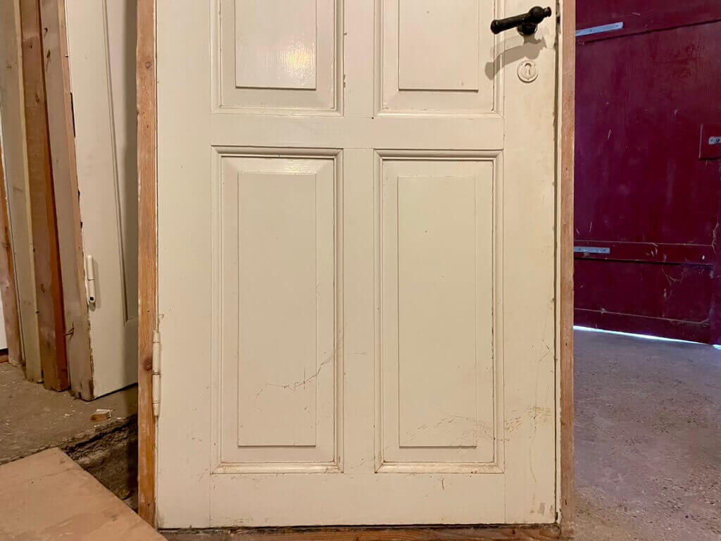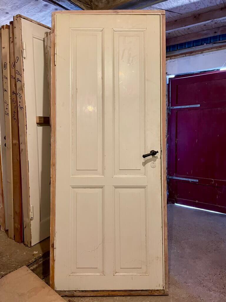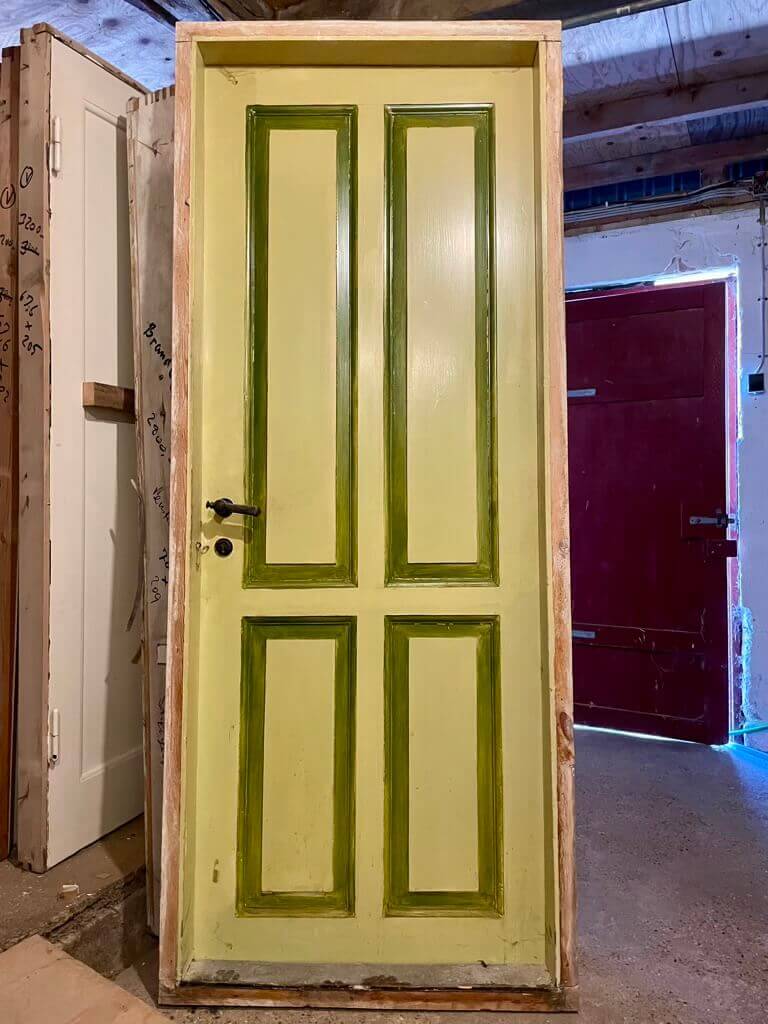 Klassisk Dannebrogsdør med karm, bundstykke og pæne greb i træ samt flotte, høje hamborghængsler.