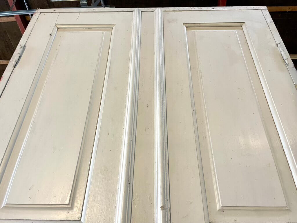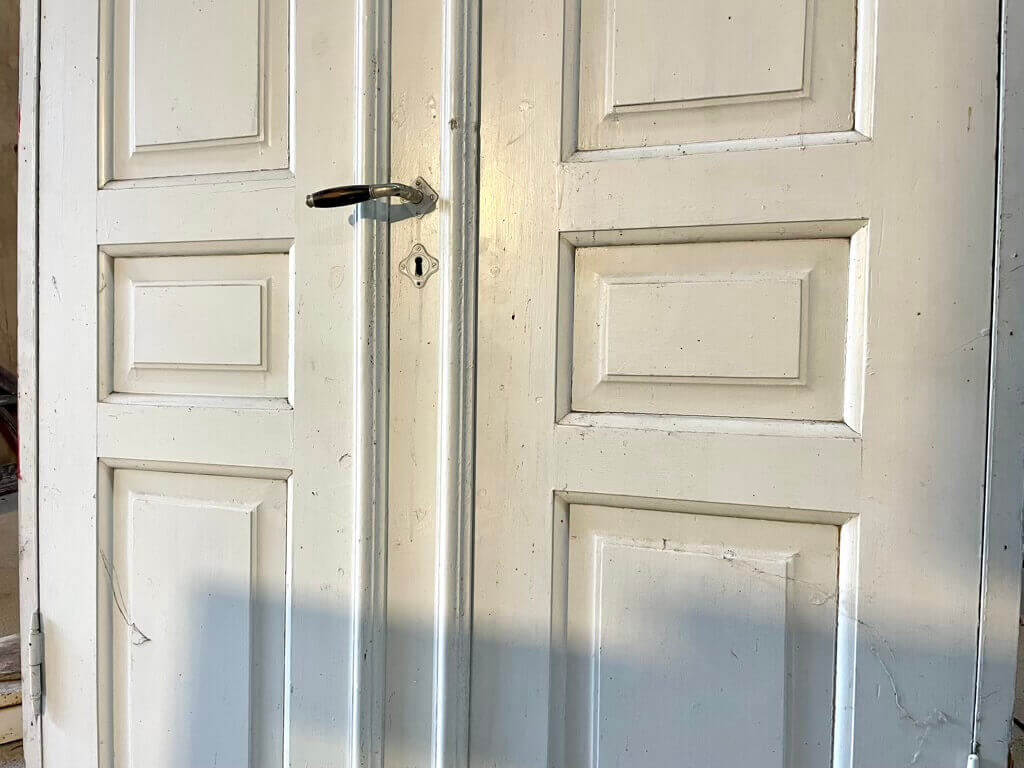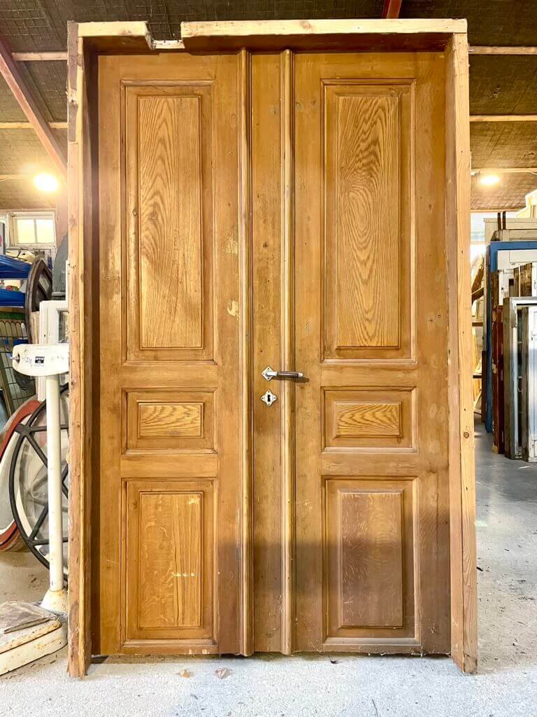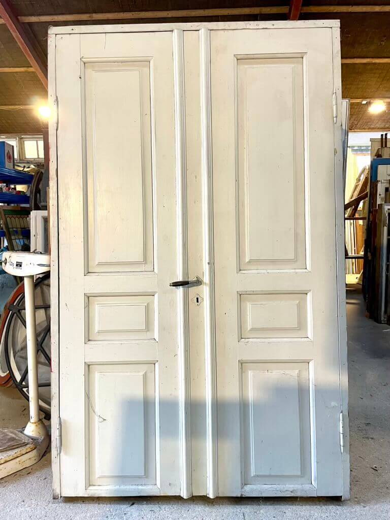 Klassisk og lav dobbelt fyldningsdør med original karm. Pæne felter, fine hamborghængsler og sundt træværk. Monteret med kønne greb og nøgleskilte.