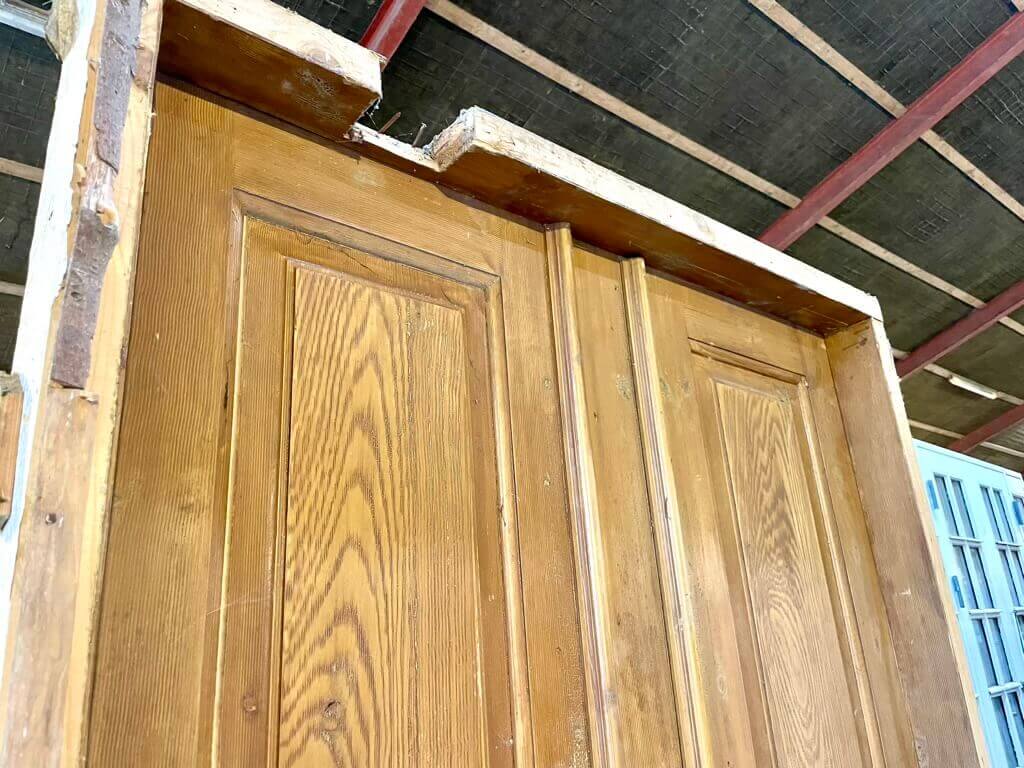 Døren har oprindeligt været højere og er afkortet lidt i bunden. I toppen af karm er afskåret et stykke pga tidligere montering - skal blot udlydes med en klods.