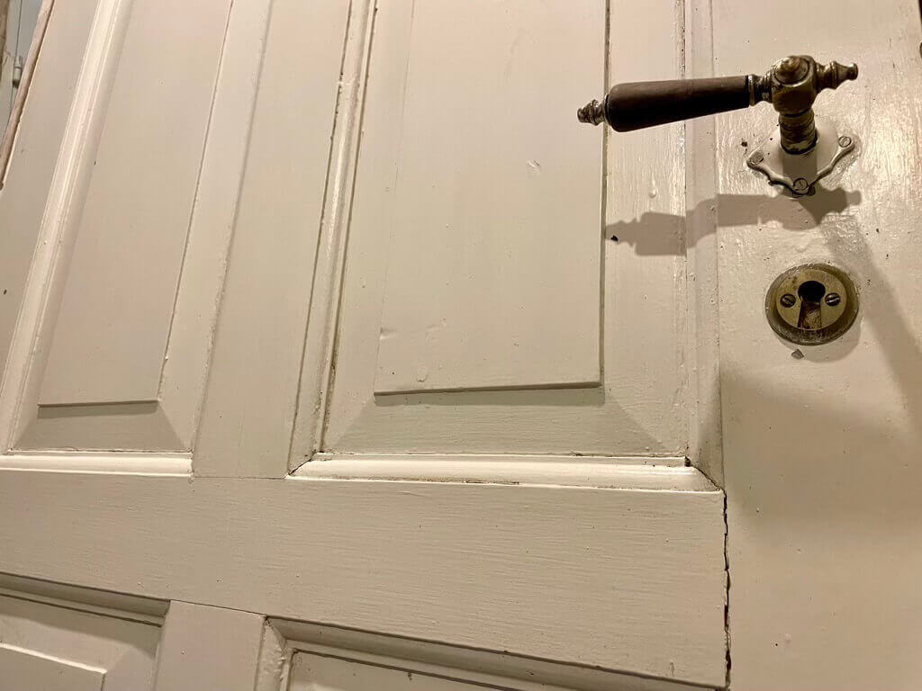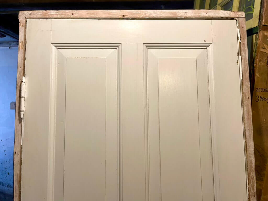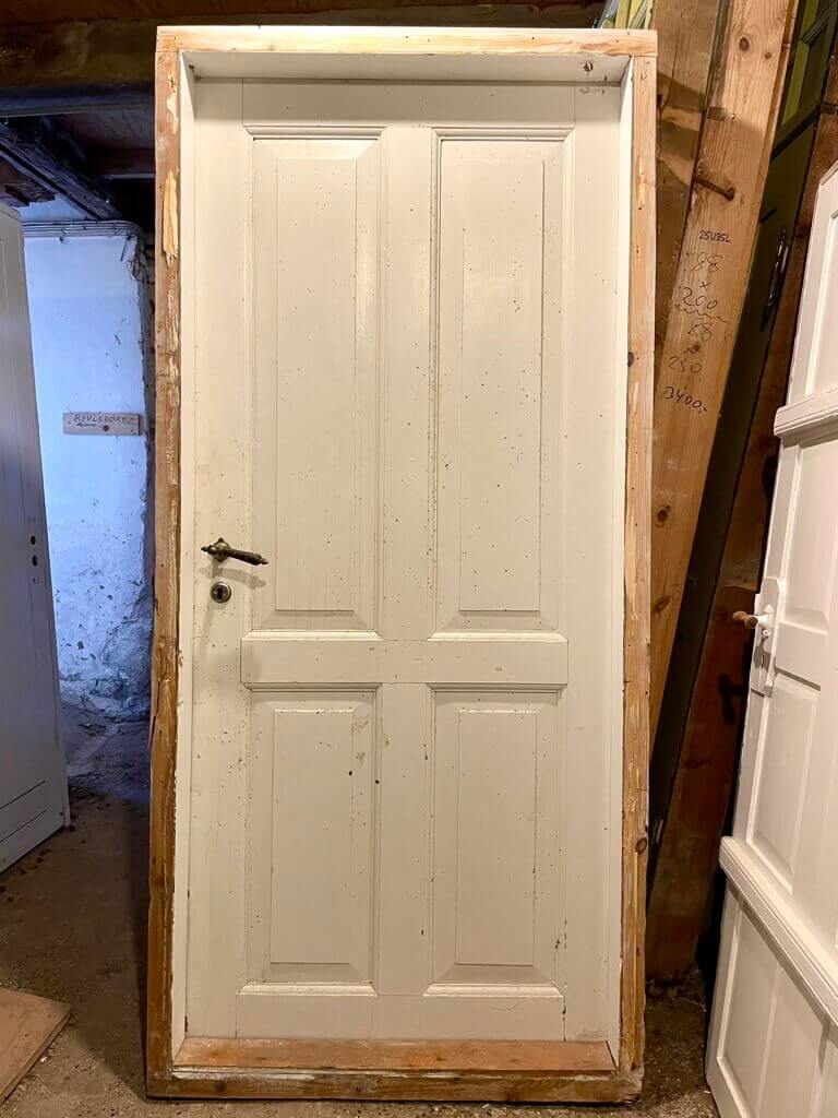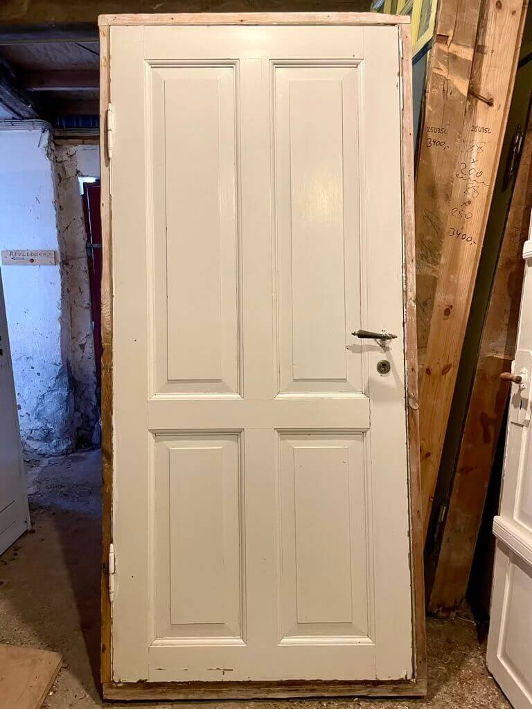 Lav og bred Dannebrogsdør med original karm og bundstykke. Monteret med fine greb i metal og træ samt pæne hamborghængsler.