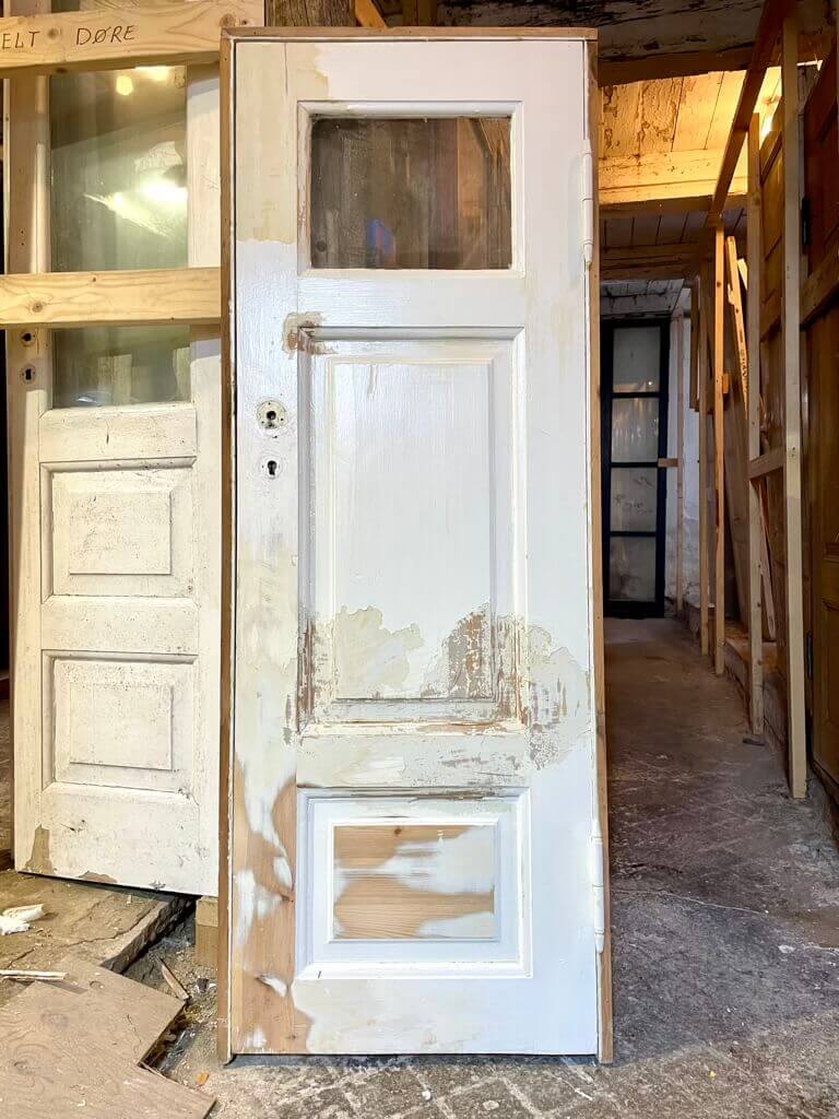 Original, lav og smal fyldningsdør med rude. Pæne fyldninger og fine hamborghængsler. Uden greb, men med låsekasse og inkl. original karm.
