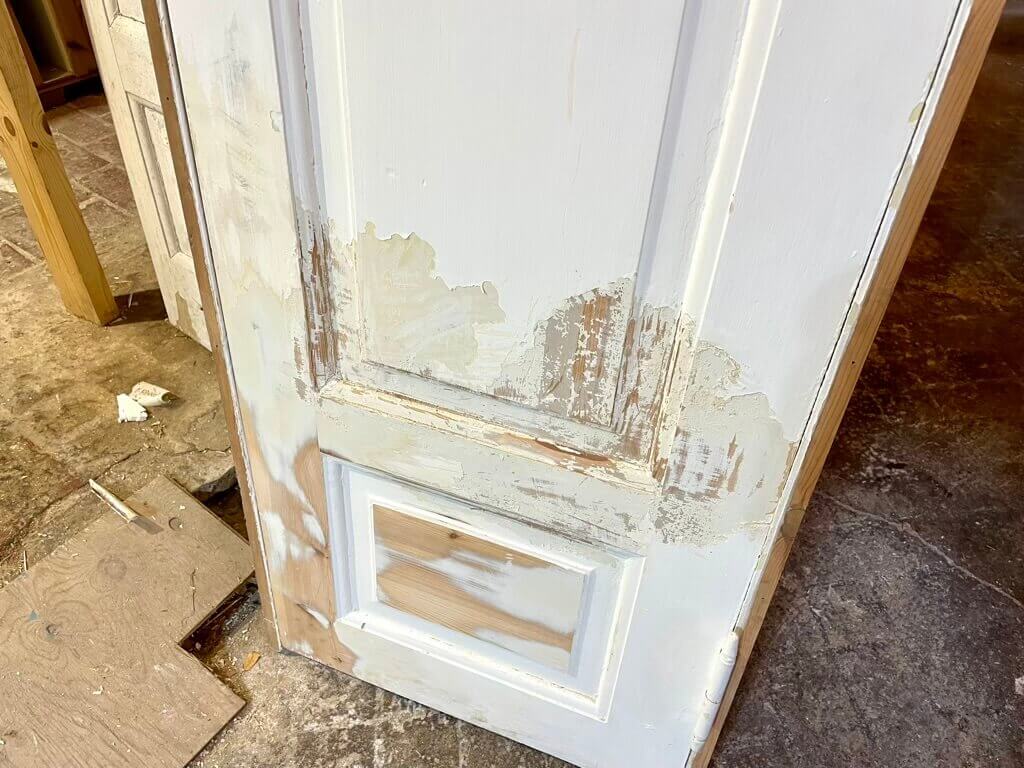 Fremstår med sundt træværk, delvist slebet og med stedvis afskallende maling.