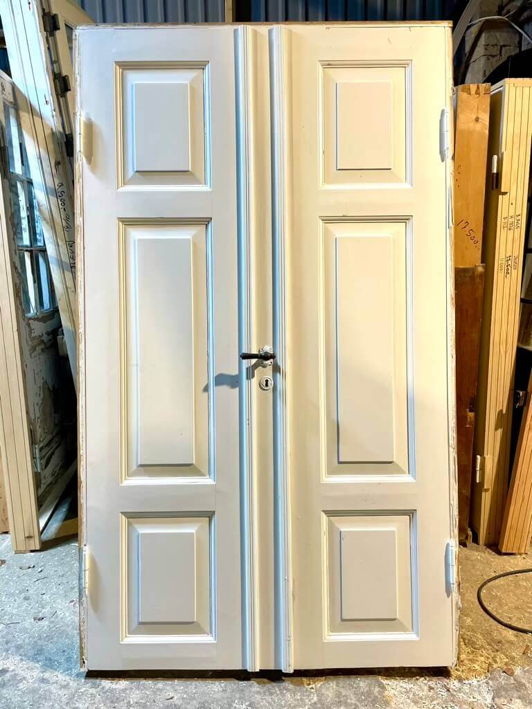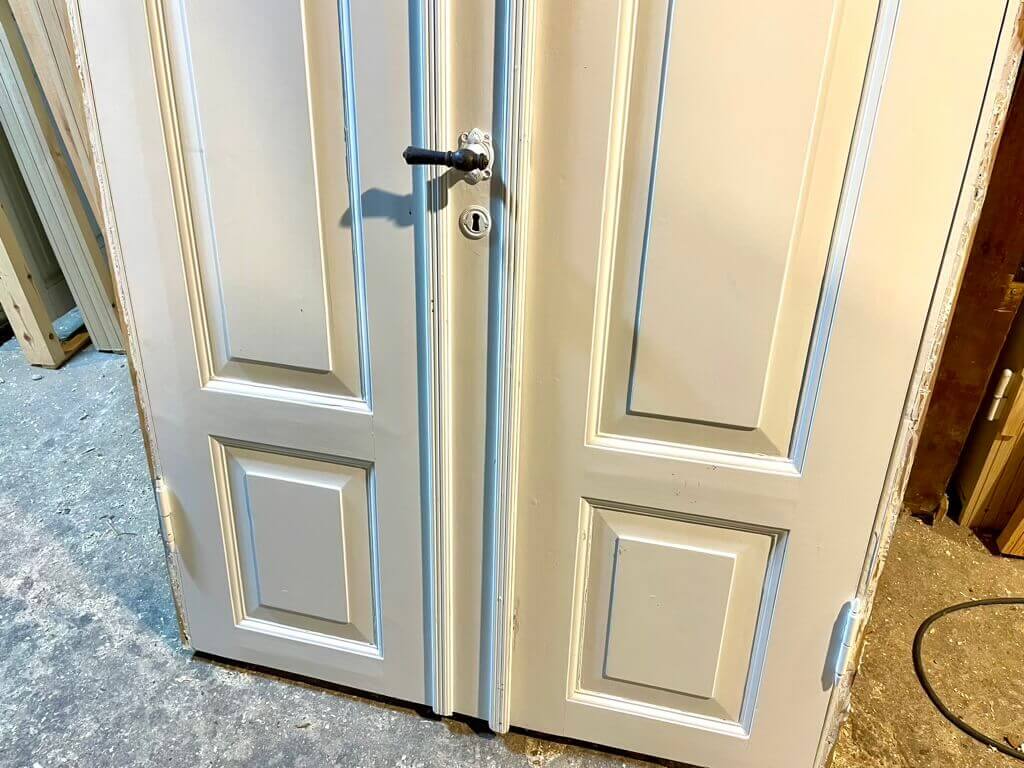 Klassisk dobbeltdør i lavt mål og med flotte fyldninger med smukke profiler og detaljer. Monteret med fine københavner-greb med tilhørende nøgleskilte.