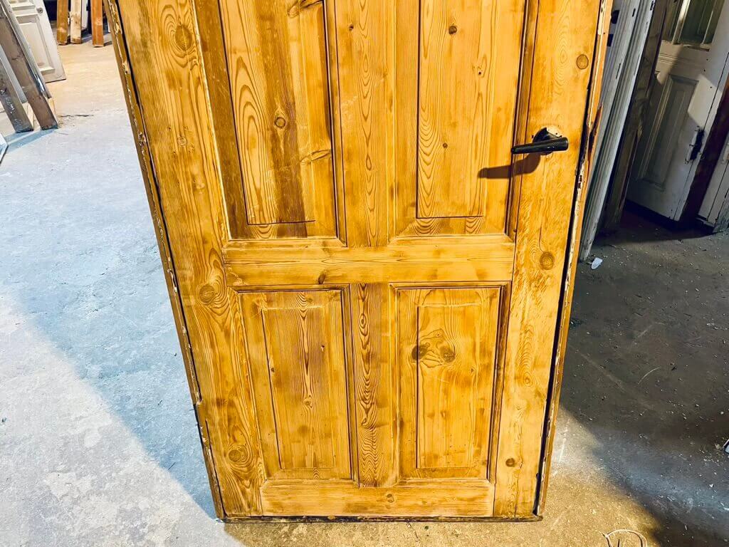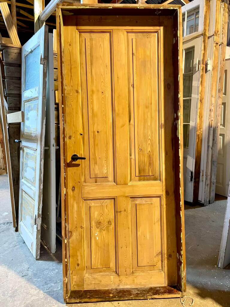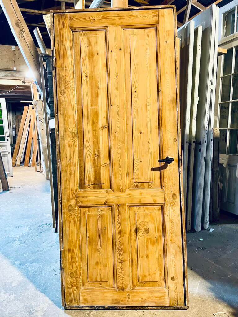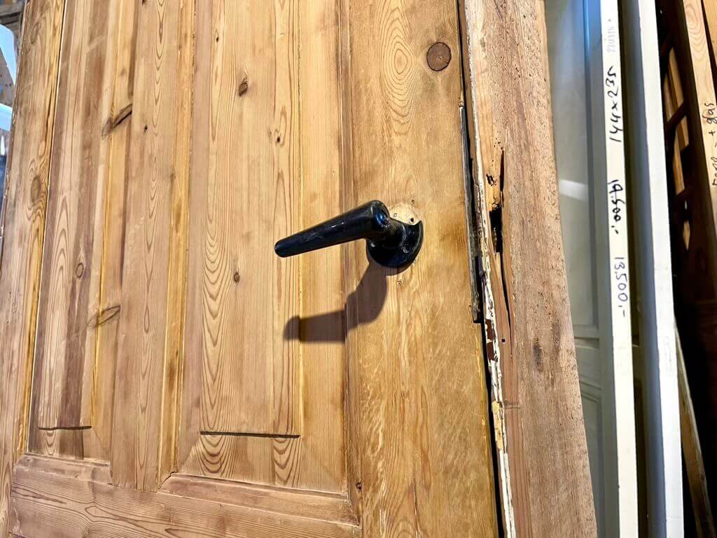 Lav, umalet Dannebrogsdør med karm og bundstykke. Fremstår med sundt træværk og almindelige brugsspor. Karmen har mindre skade i siden, men ikke alvorlig.