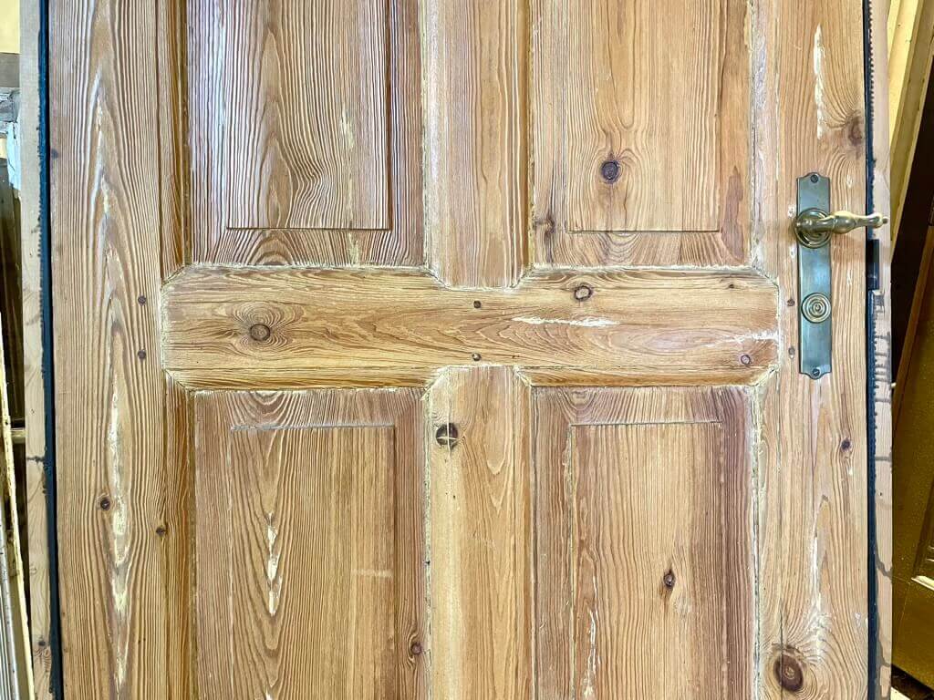 Smuk og klassisk Dannebrogsdør med fine krydsgreb og langskilte i messing. Fremstår med synligt patineret overflade og ellers sundt træværk. Døren er ikke malet, men behandlet med en olie.