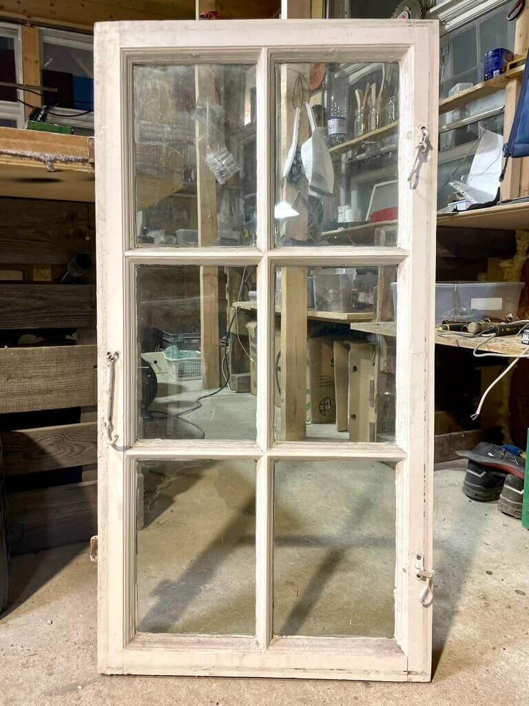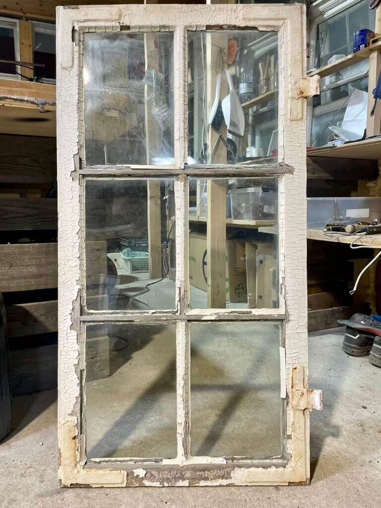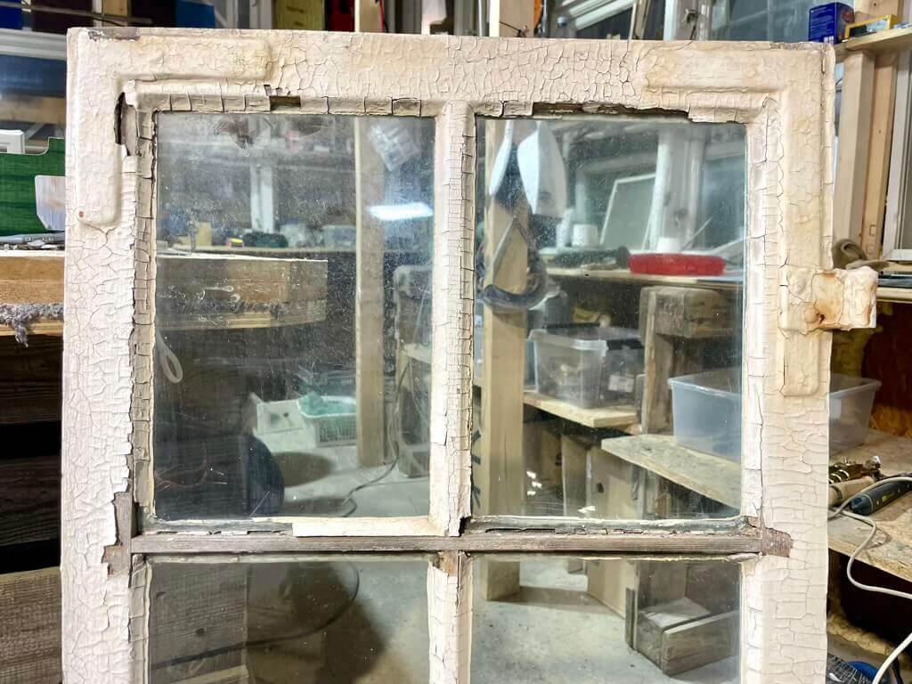 Lille 6-ruders vindue til istandsættelse, da maling (mest udvendigt) er kraftigt afskallende ligesom kit mangler flere steder. Træværk fremstår fint og sundt og hjørnebånd ser fine ud. Fra Den Spanske Ambassade i København.