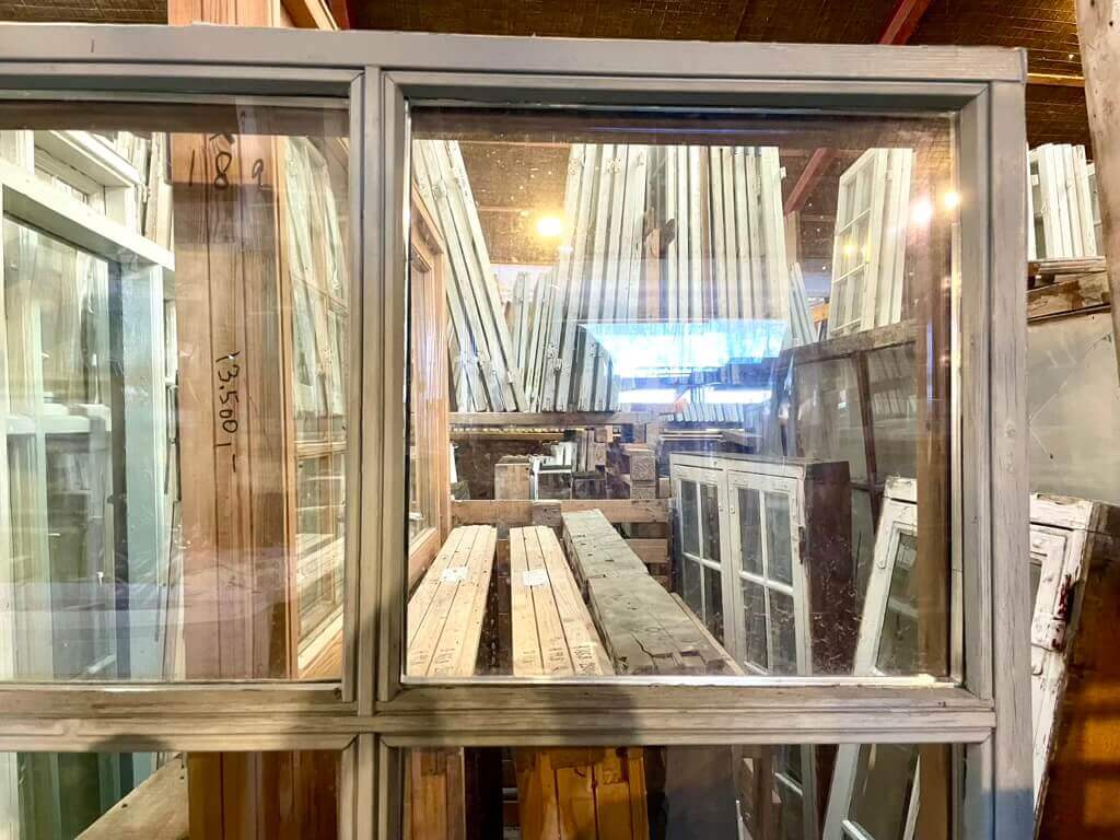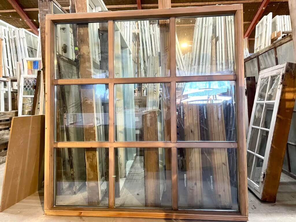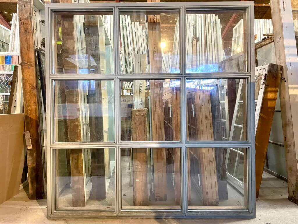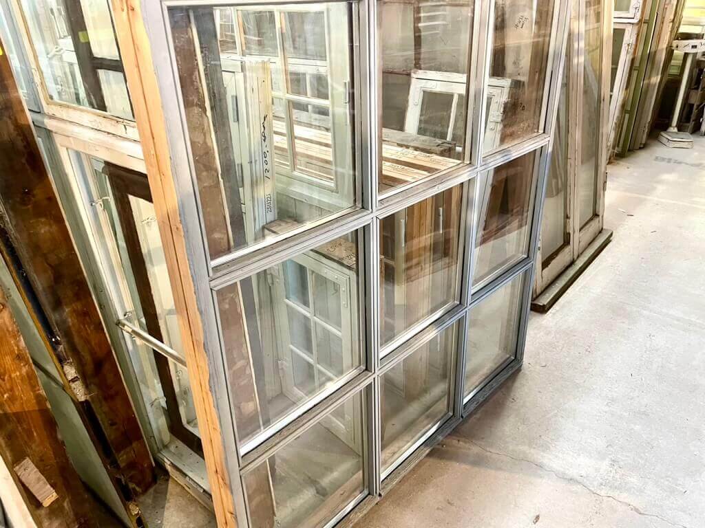 Usædvanligt stort fastkarmsvindue med 9 rudefelter bestående af to-lags termoruder. Med fint og sundt træværk og intakte vandnæser. Maling trænger til opfriskning udvendigt, men ellers ganske pænt.