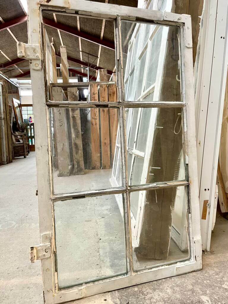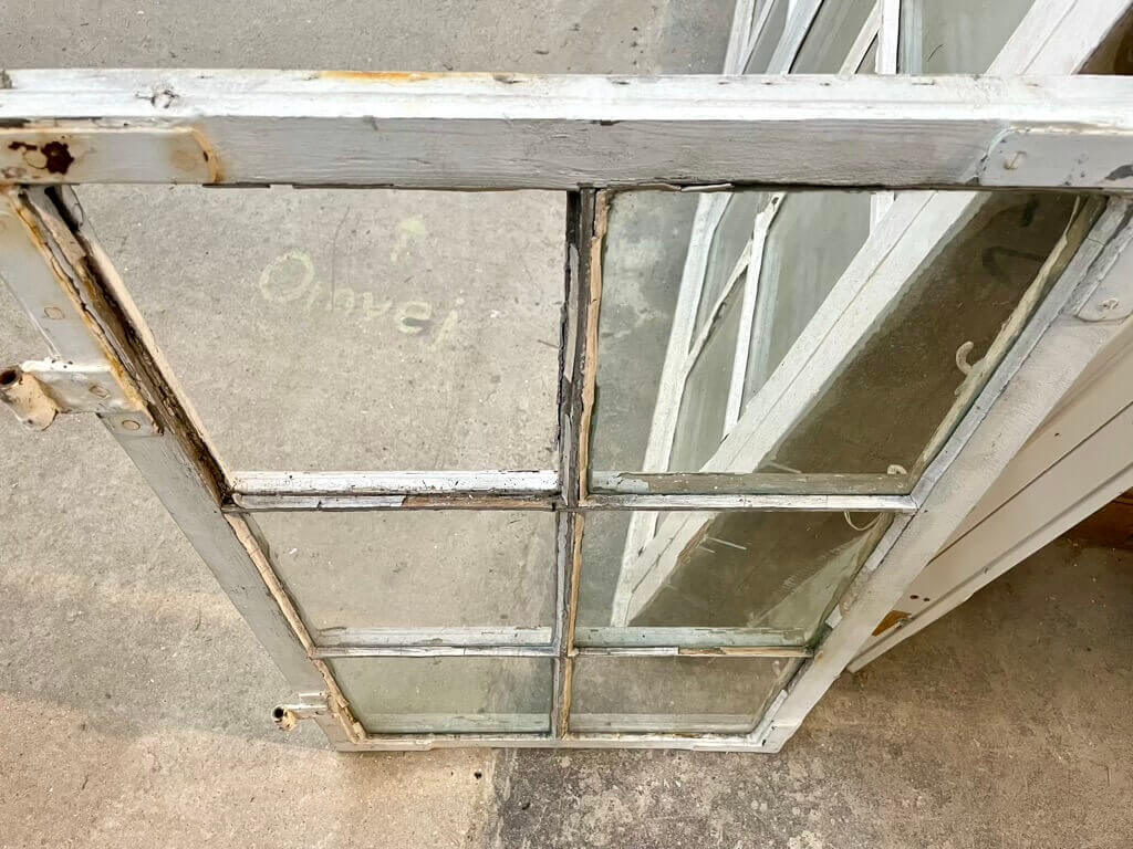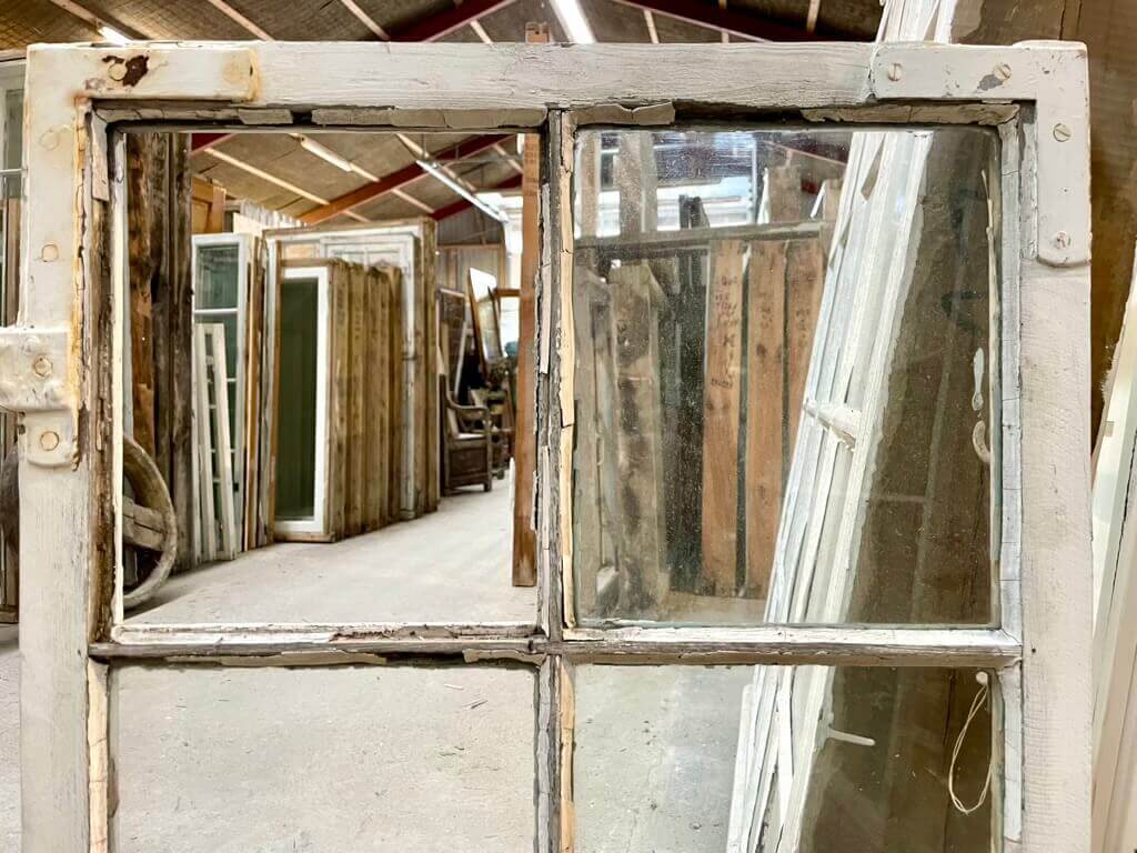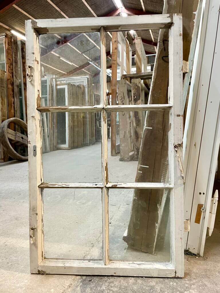 Fin, mindre 6-ruders vinduesramme. Flere ruder er i originalt, gammelt glas. Et par enkelte i det oprindelige parti har nye hjørnebånd - men ellers er det de originale. Maling er afskallende og kit er stedvis løs/manglende. Flere importer mangler en rude - derfor reduceret pris (nyt glas kan skæres ved køb).