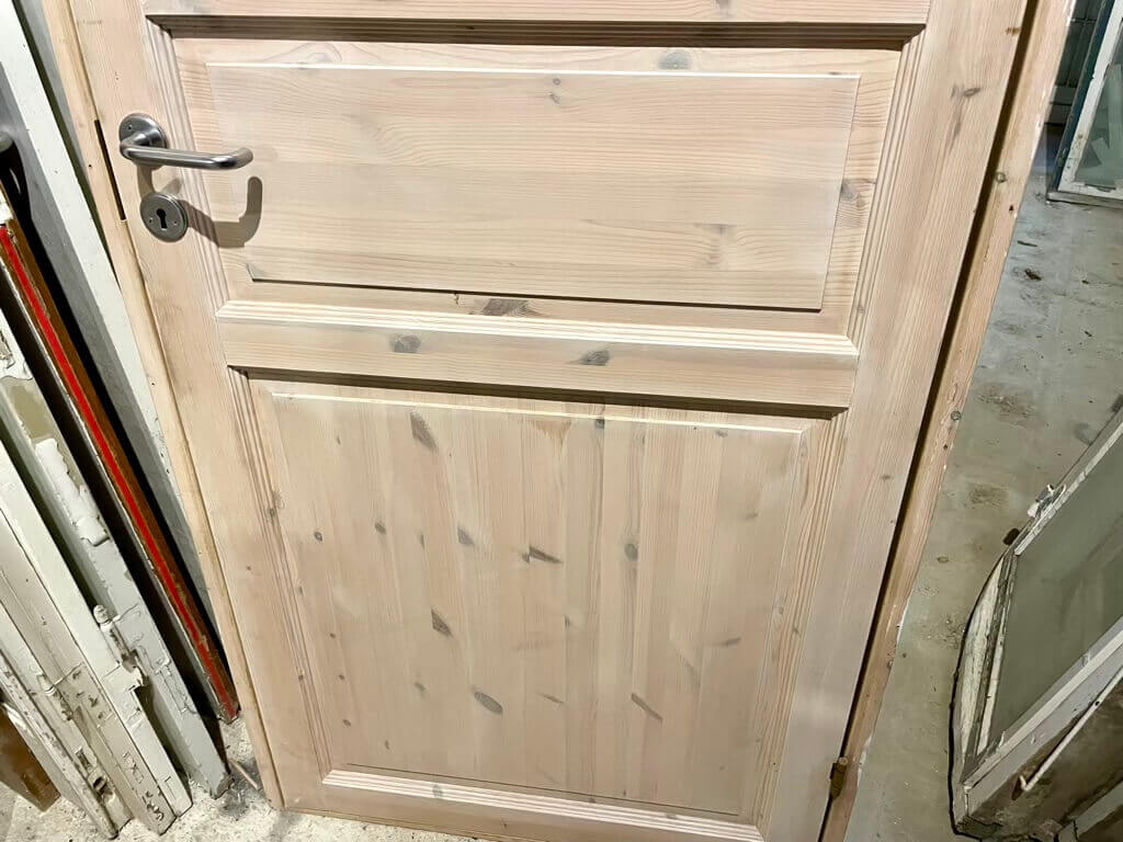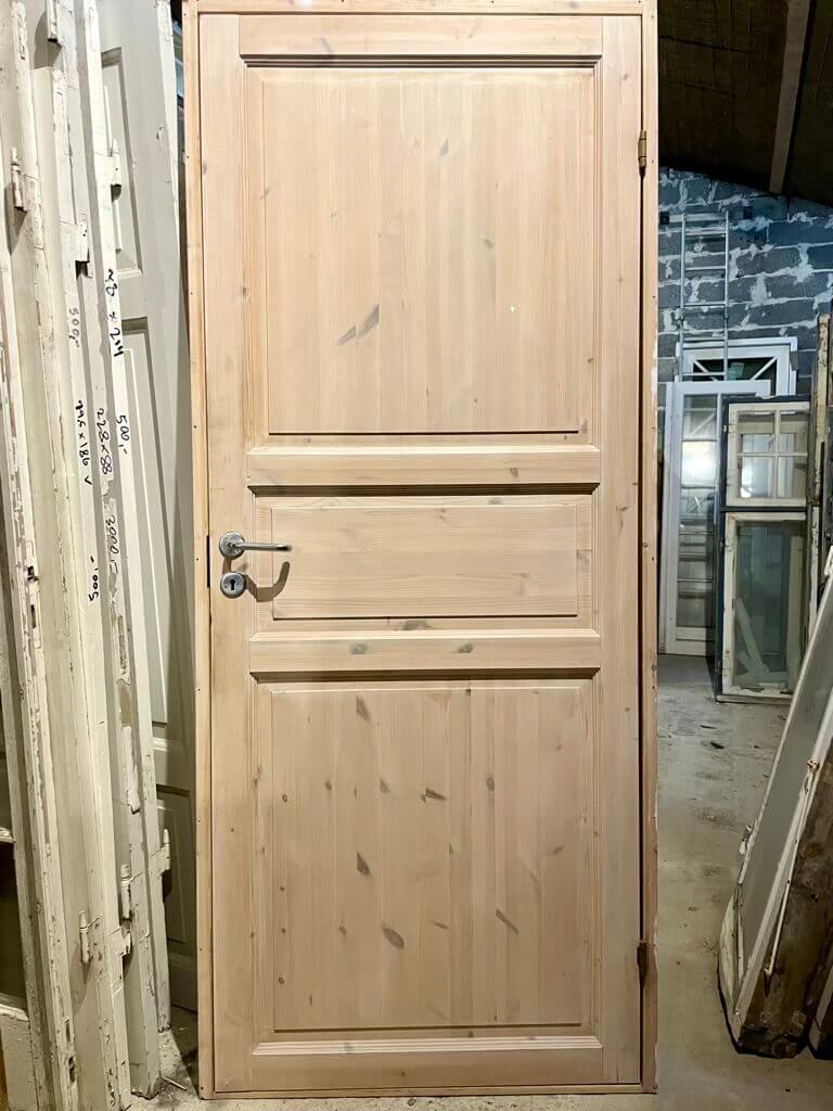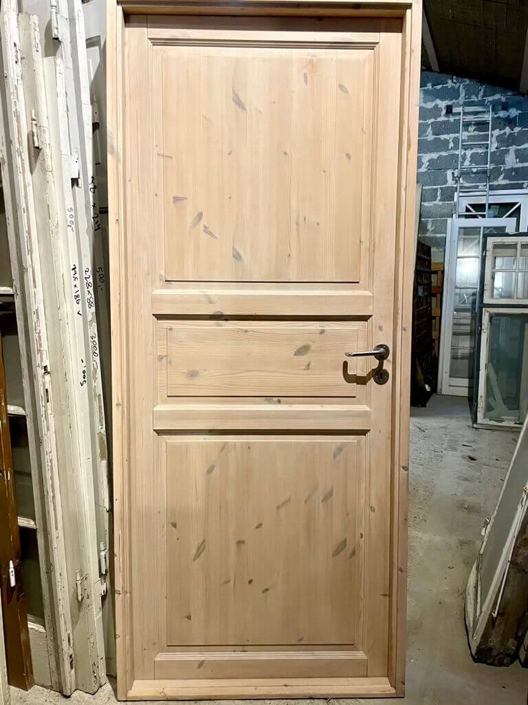 Lidt nyere dør end vi plejer at have på lager. Med tre fyldninger og monteret med aluminiumsgreb. Med karm og bundstykke. Fremstår som ny og har ikke været monteret. Overfladen er mat, måske sæbe- eller ludbehandlet. Med snap in-hængsler.