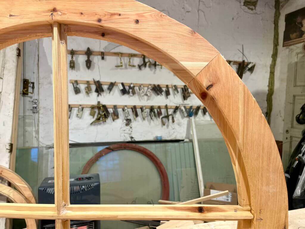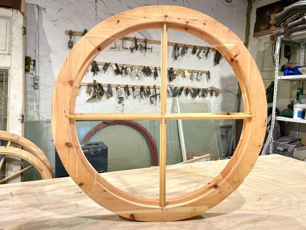 Nylavet, rundt vindue med fire rudefelter adskilt af klassiske, smalle sprosser. Tilvirket på eget værksted. Behandlet med linolie og klar til ruder og maling.