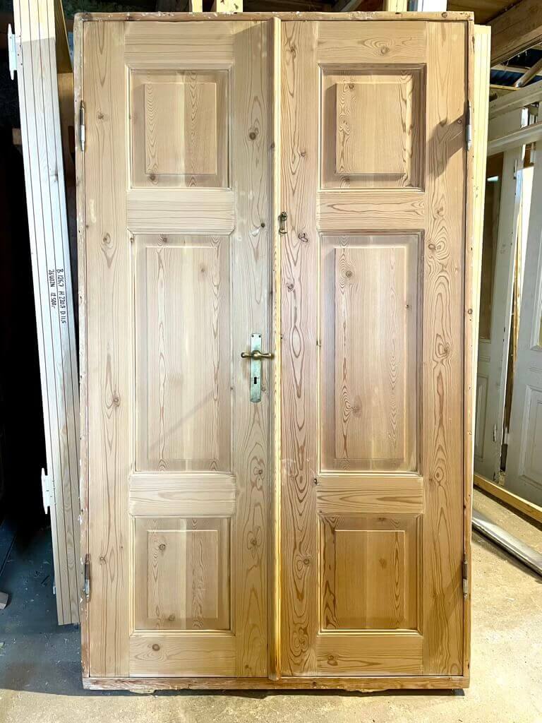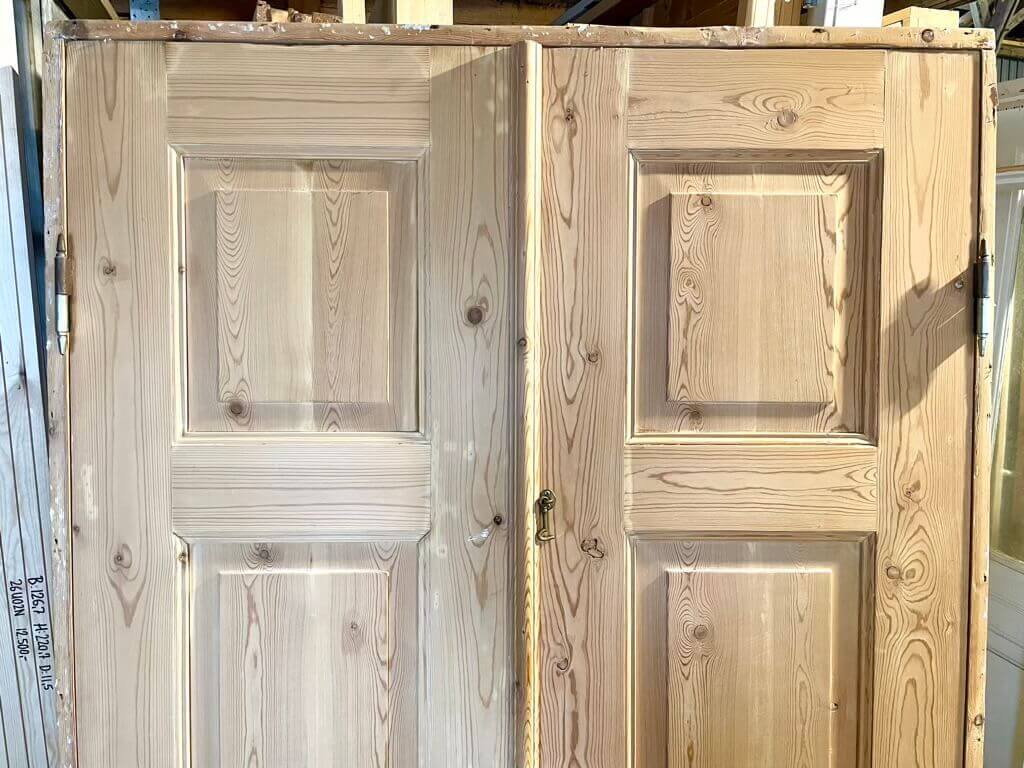Smuk og afsyret, original dobbelt fyldningsdør med karm og bundstykke. Monteret med fine greb og langskilte i messing. Fremstår med sundt træværk samt forventelig slitage og overfladiske brugsspor. Afsyrede hængsler, der står i råt jern.