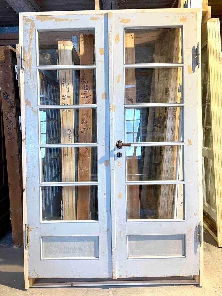 Original, fransk dobbeltdør med store rudepartier. Dørbladet fremstår i god stand med behov for ny maling. Monteret med pæne Københavner-greb med tilhørende nøgleskilte.