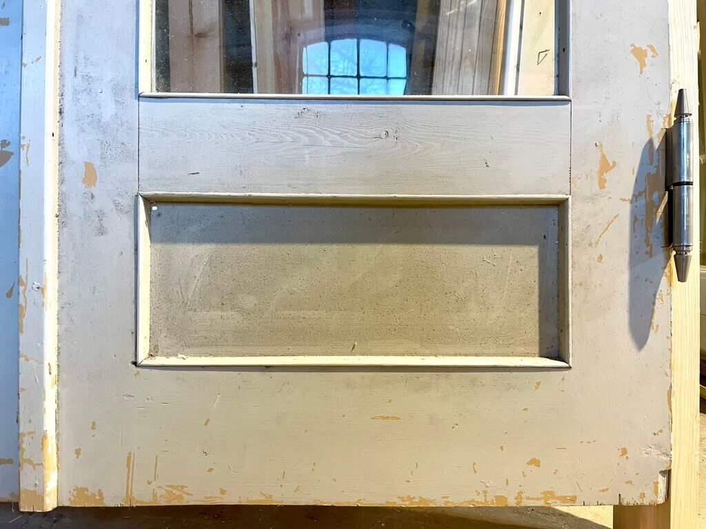 Med ny karm af træ fra Københavns Listefabrik samt nye hamborghængsler. Den gående dør er venstrehængt.