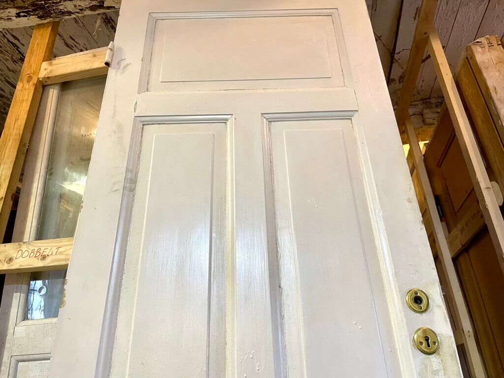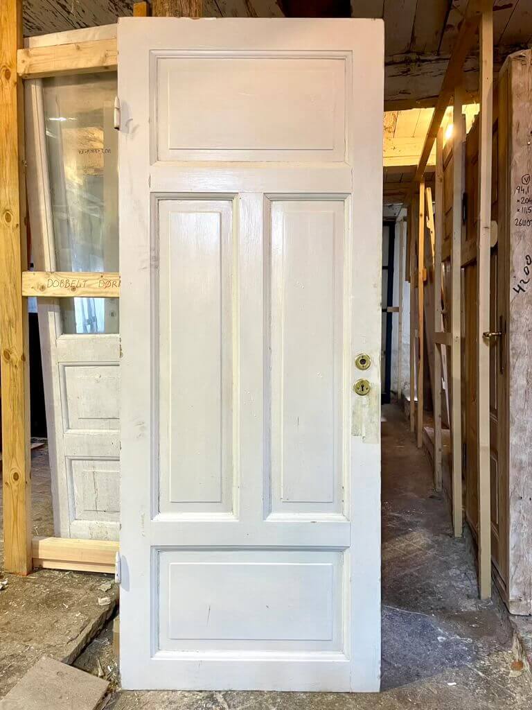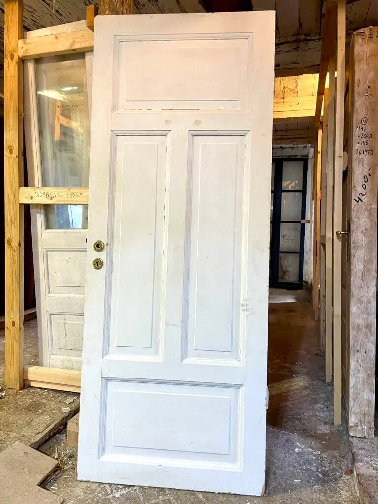 Original fyldningsdør med fire klassiske felter. Sundt træværk samt almindelige, overfladiske brugsspor og let afskallende maling. Oprindeligt venstrehængt. Med låsekasse, uden greb og karm.