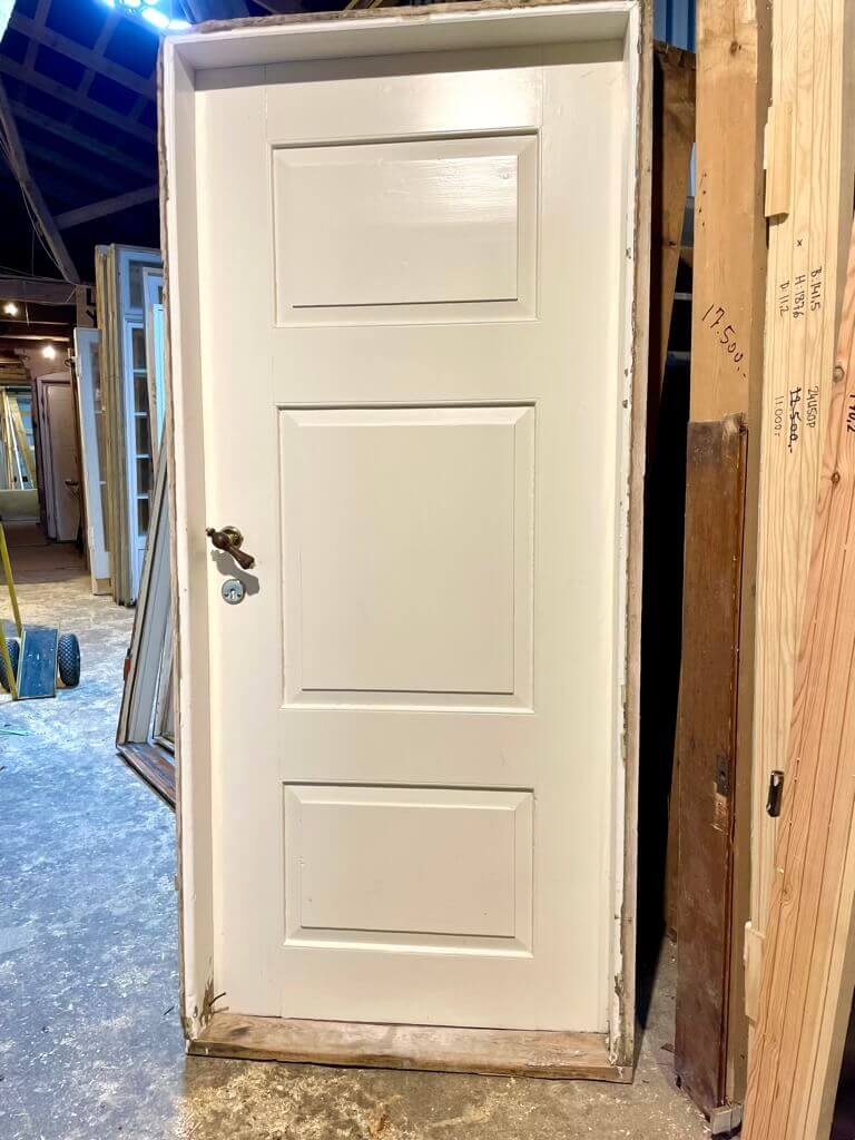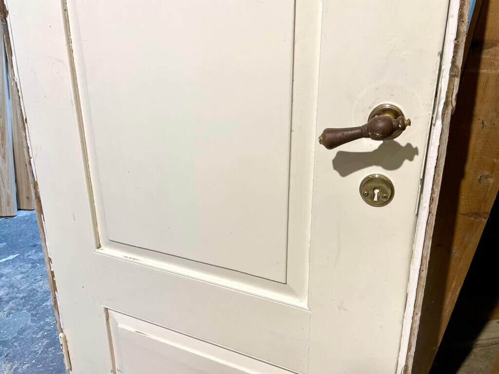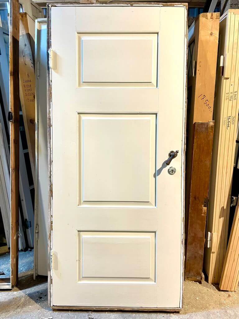 Original, lav bondehusdør med karm og bundstykke. Tre felter på begge sider. Monteret med greb i træ og messing på roset i messing. Låsekasse skal muligvis skiftes.